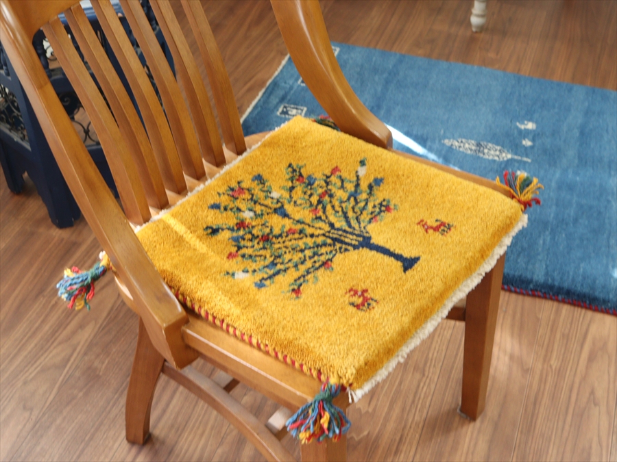- ギャッベ イラン産手織り 座布団サイズ 38x39cm イエロー 花をつけた生命の木