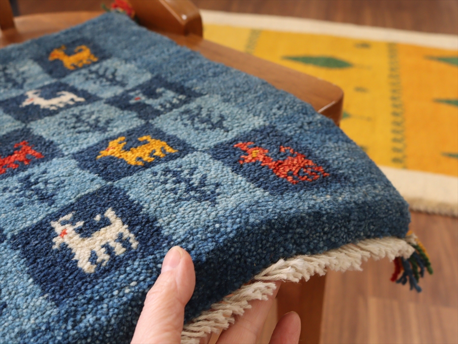 ギャッベ イラン産手織り 座布団サイズ 40x43cm ブルー 市松模様 タイル