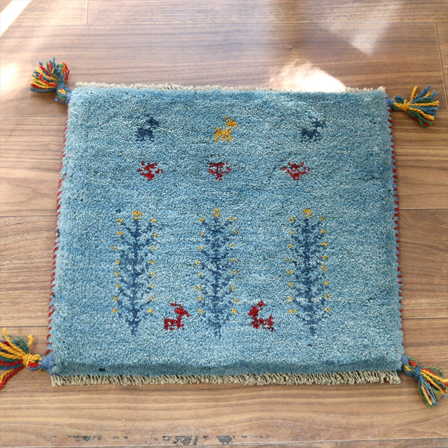 ギャッベ イラン産手織り 座布団サイズ 40x44cm 明るいブルー 生命の木と動物