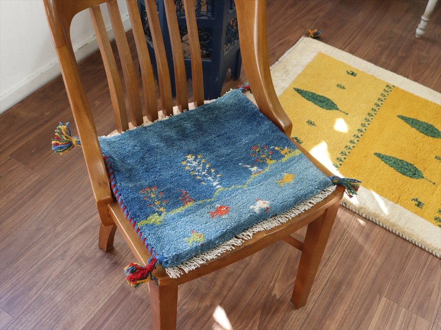 ギャッベ イラン産手織り 座布団サイズ 36x42cm ブルー 魚のいる湖