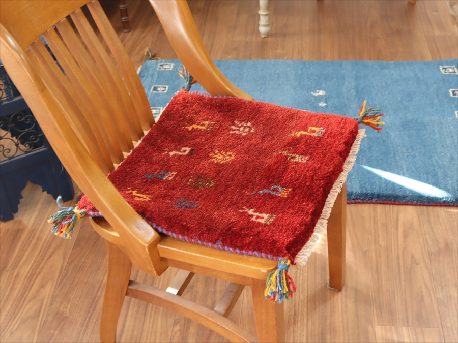 ギャッベ イラン産手織り 座布団サイズ 41x42cm レッド 動物と草花モチーフ シンプル