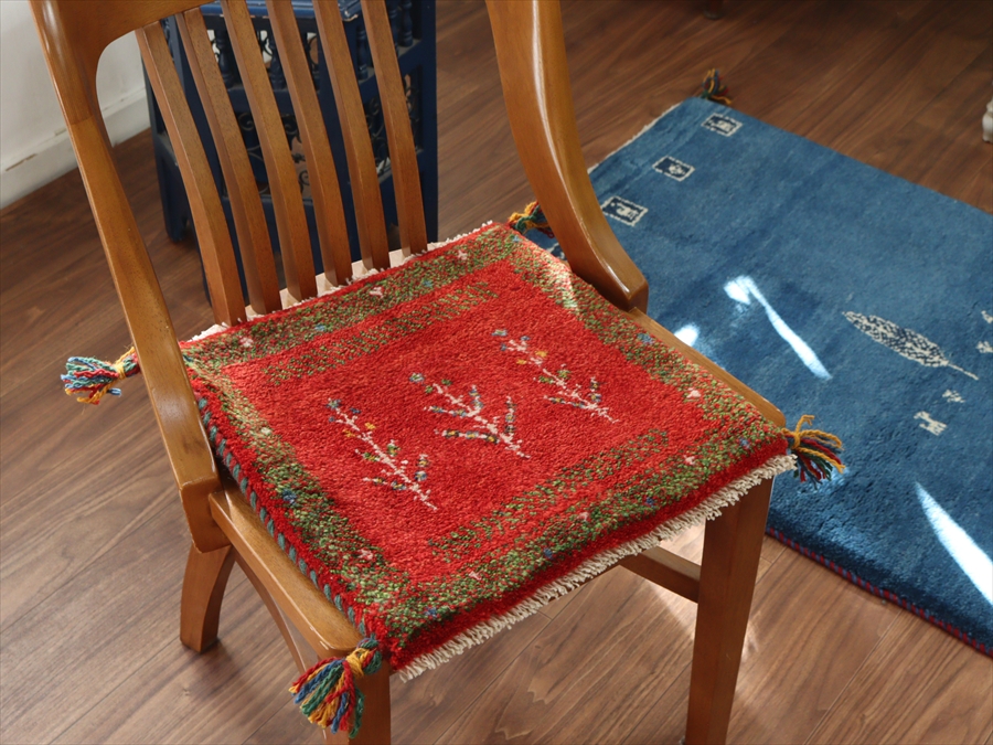 | 何枚も集めたくなる、40cm角の座布団サイズギャベ。四隅に大きなポンポンのついた、伝統的なスタイルでおられています。フローリングに並べて座布団がわりに使ったり、ベンチやダイニングチェアの座面など、使い方はいろいろ。壁にタペストリーのように飾るのもおすすめです。 |