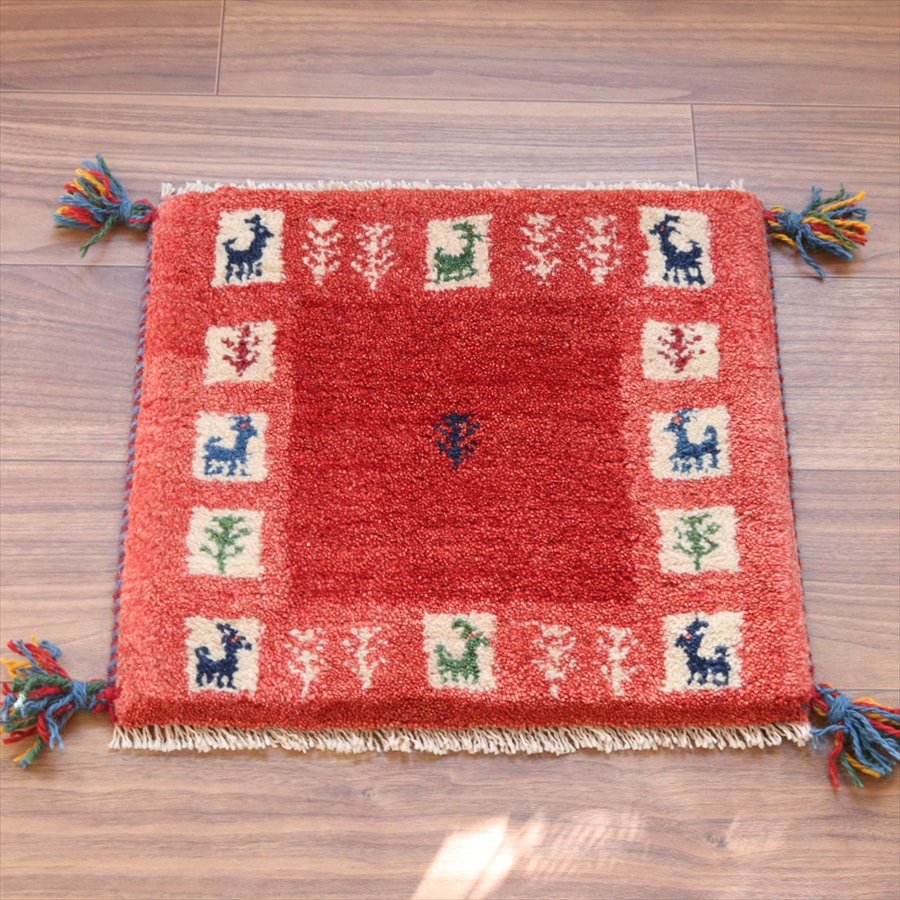 ギャッベ イラン産手織り 座布団サイズ 39x42cm レッド ツートーンカラー タイルモチーフ