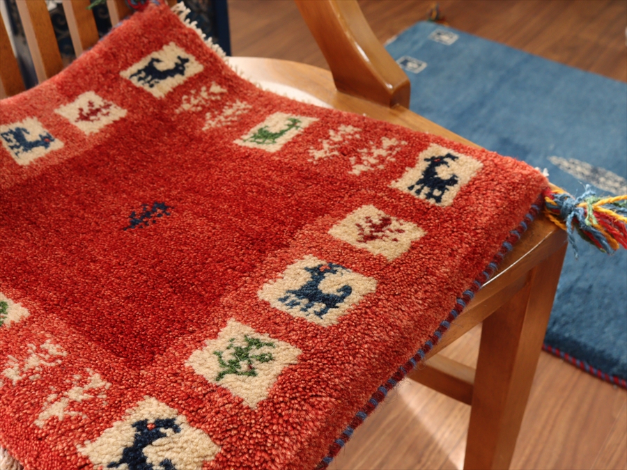 | 何枚も集めたくなる、40cm角の座布団サイズギャベ。四隅に大きなポンポンのついた、伝統的なスタイルでおられています。フローリングに並べて座布団がわりに使ったり、ベンチやダイニングチェアの座面など、使い方はいろいろ。壁にタペストリーのように飾るのもおすすめです。 |