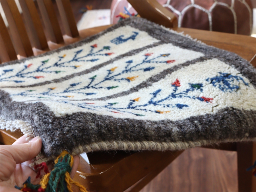ギャッベ イラン産手織り 座布団サイズ 38x42cm ナチュラルアイボリー&グレー 花をつけた生命の木