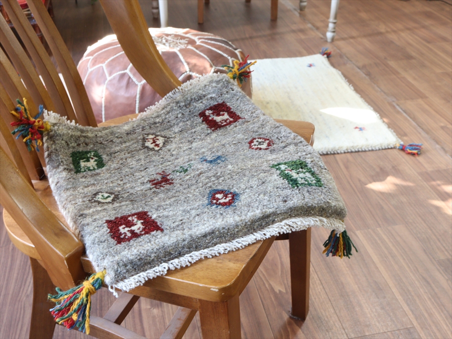 ギャッベ イラン産手織り 座布団サイズ 38x40cm 無染色の羊毛のグレー