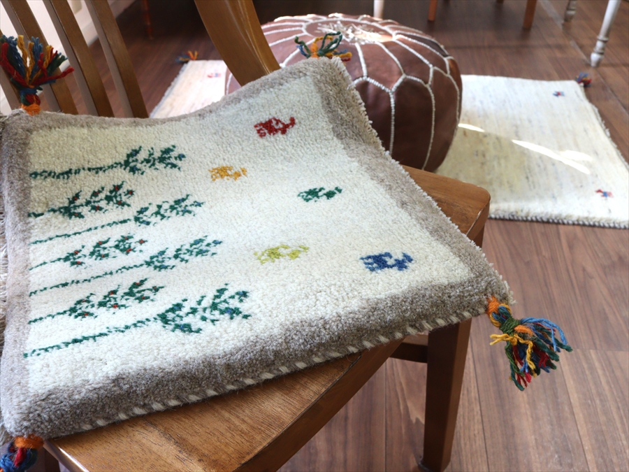 ギャッベ イラン産手織り 座布団サイズ 39x40cm ナチュラルアイボリー グリーンの草花