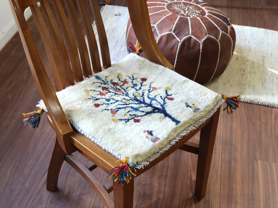 ギャッベ イラン産手織り 座布団サイズ 38x41cm ナチュラルアイボリー 花をつけた生命の木