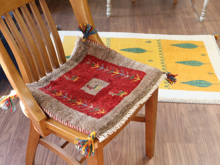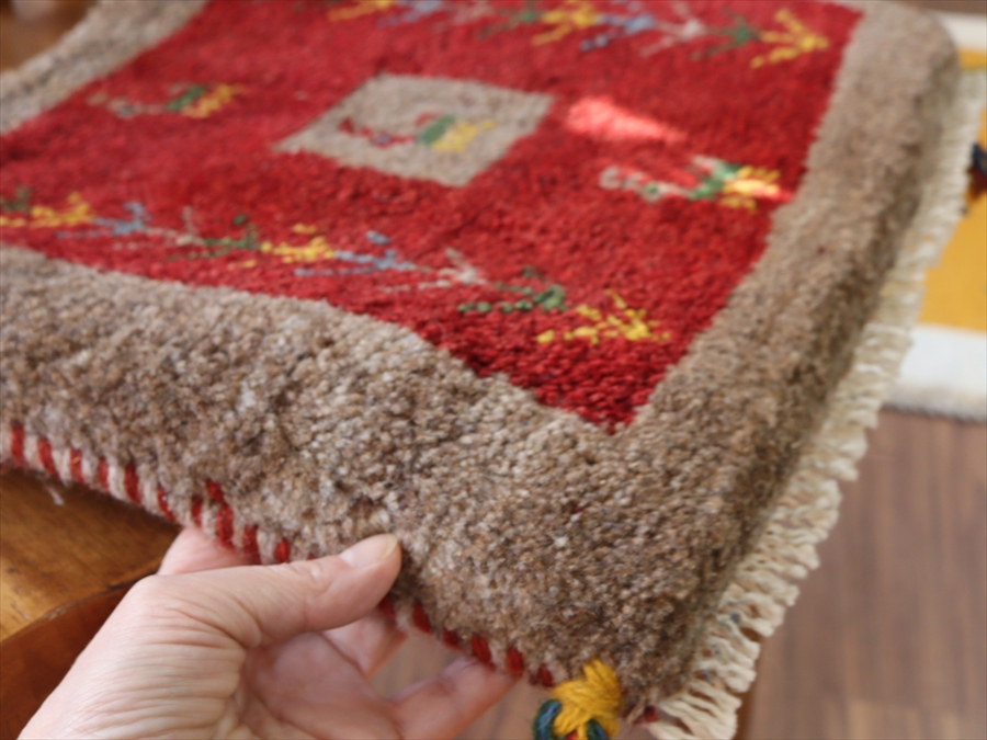 ギャッベ イラン産手織り 座布団サイズ 38x45cm レッド &ベージュブラウン