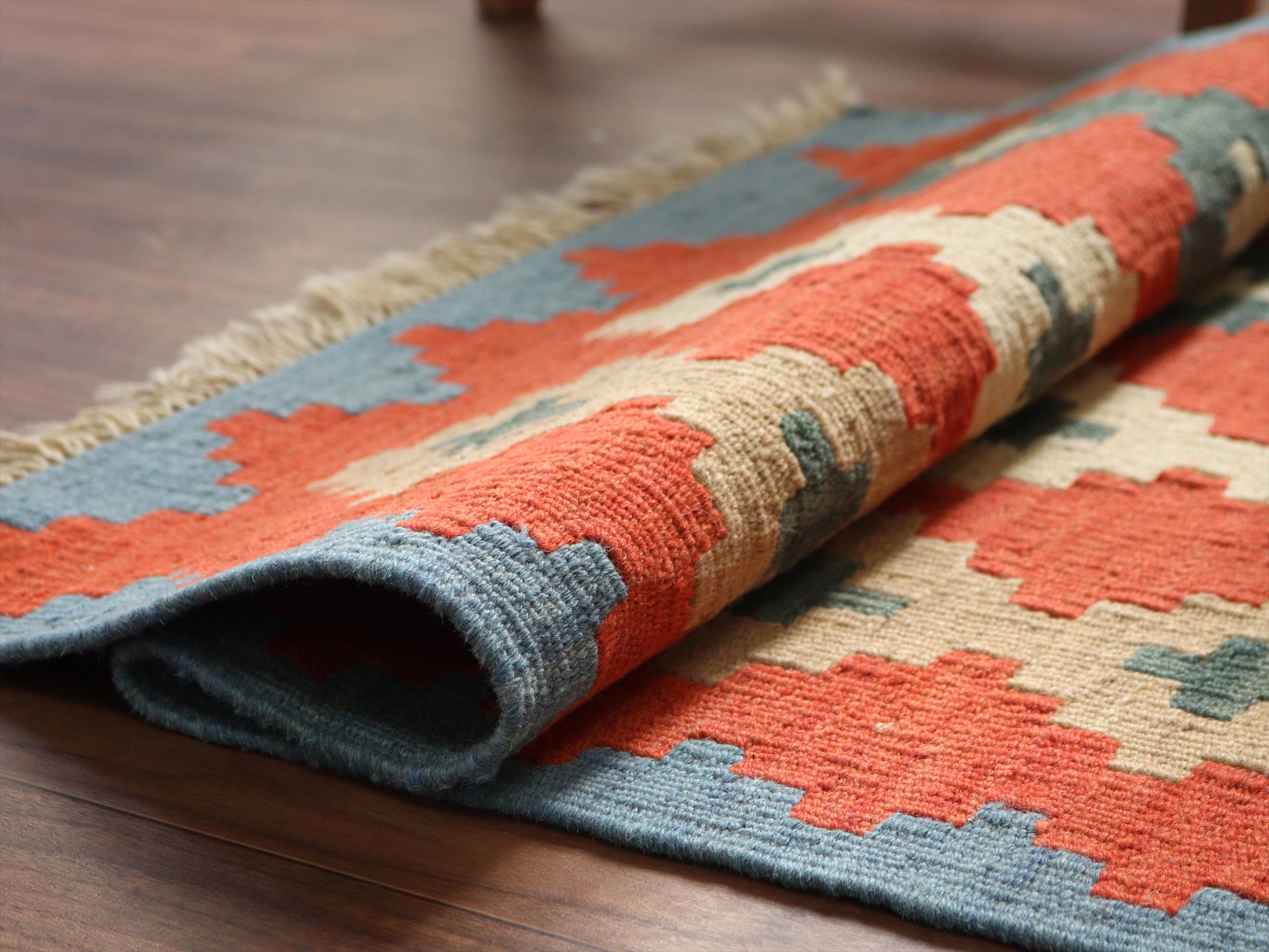 - 手織りキリム イラン シラーズ87×65cm カラフルな幾何学モチーフ