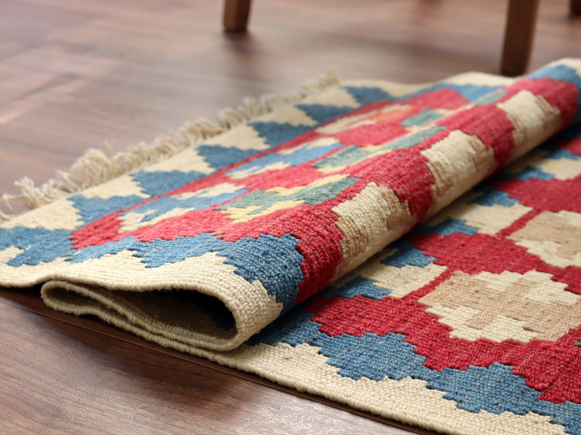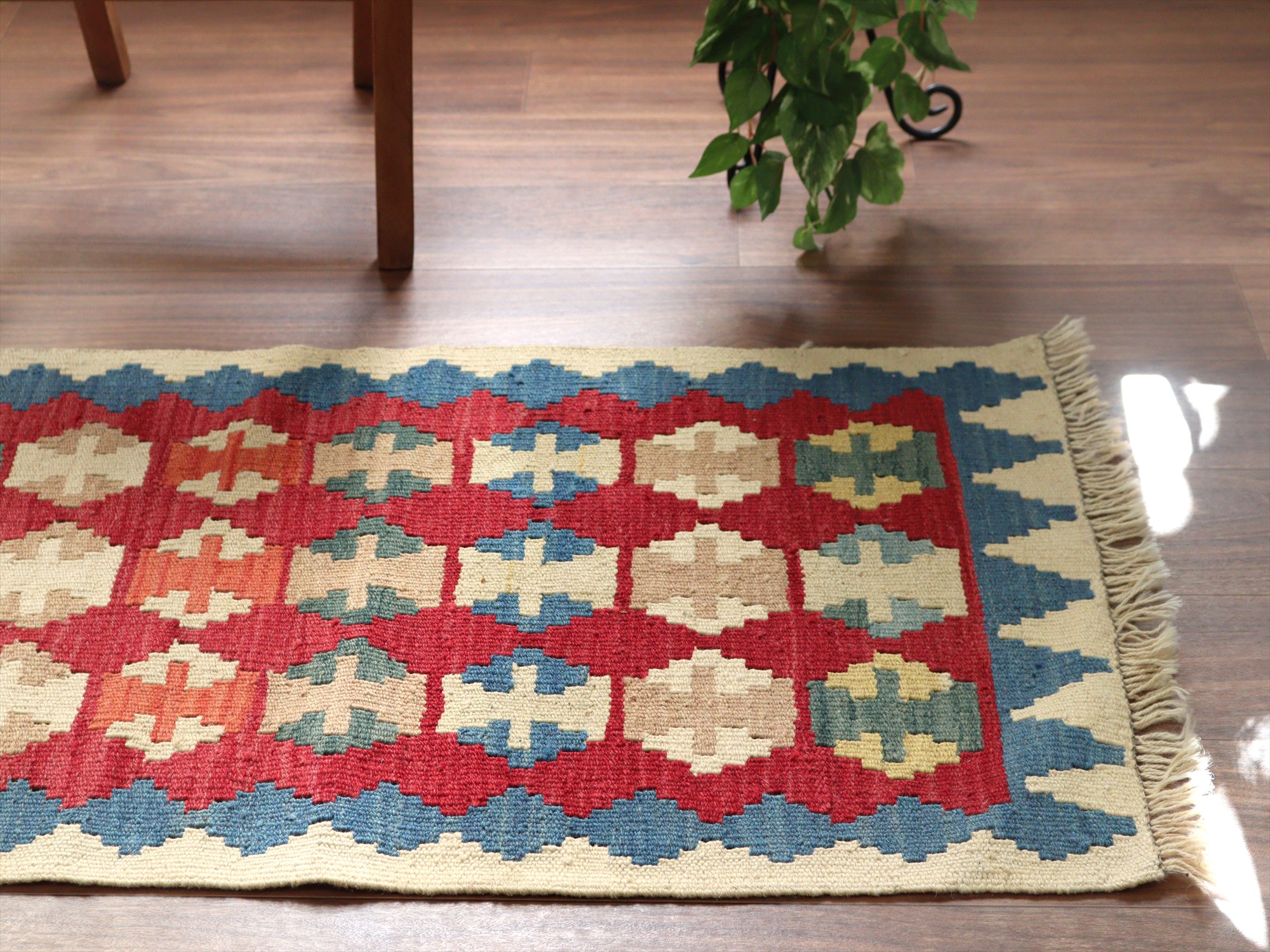 - 手織りキリム イラン シラーズ103×61cm カラフルな幾何学モチーフ