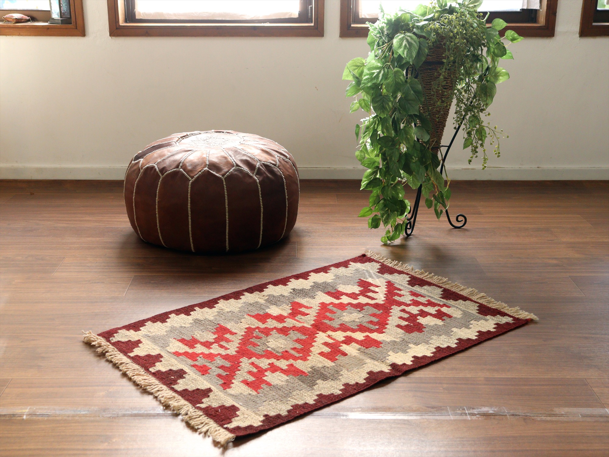 | 6-7mm程度の厚みがあり、パイル(毛足)がない平織りの敷物で表面は少しザラっとした肌ざわりです。織り手の自由なアイデアでデザインされていますので、左右対象でなかったり、モチーフが少しずれていたりということもありますが、世界で一枚だけの作品ですからその点はご了承ください。 |