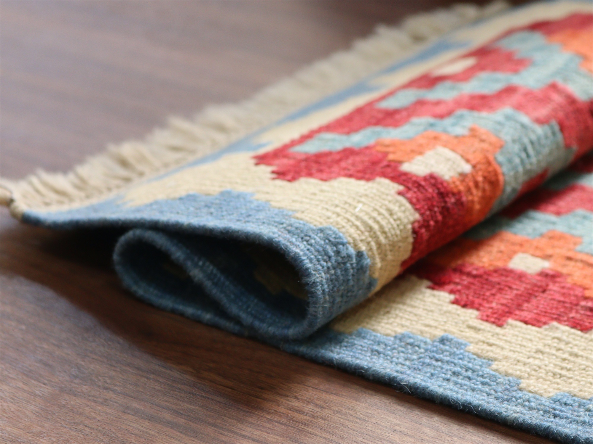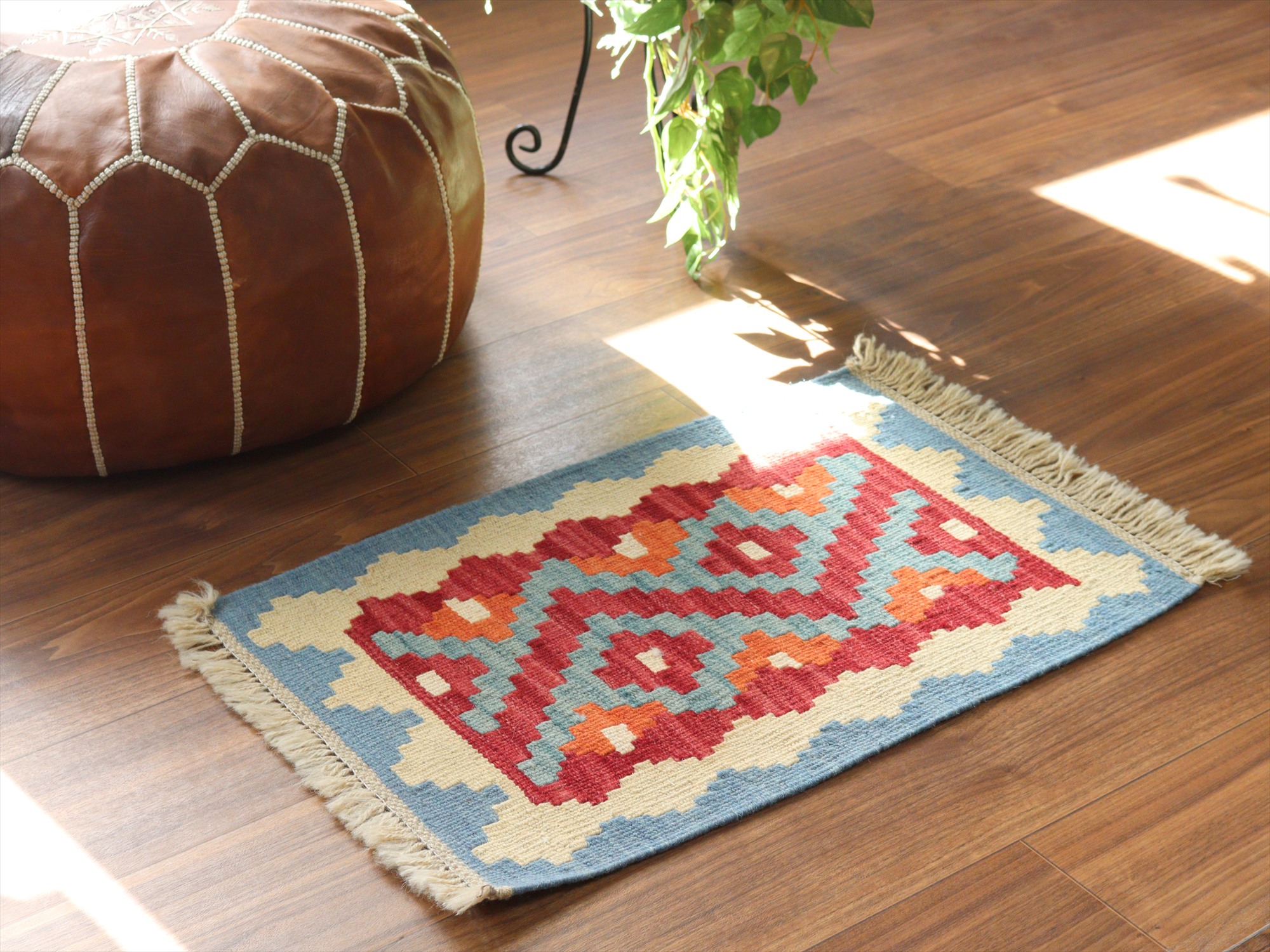 | しっかりとしたハリのある織りで、厚みは4mm前後。多少カタチがゆがみがありますが、手織りキリムならではの味わいとご理解ください。 |