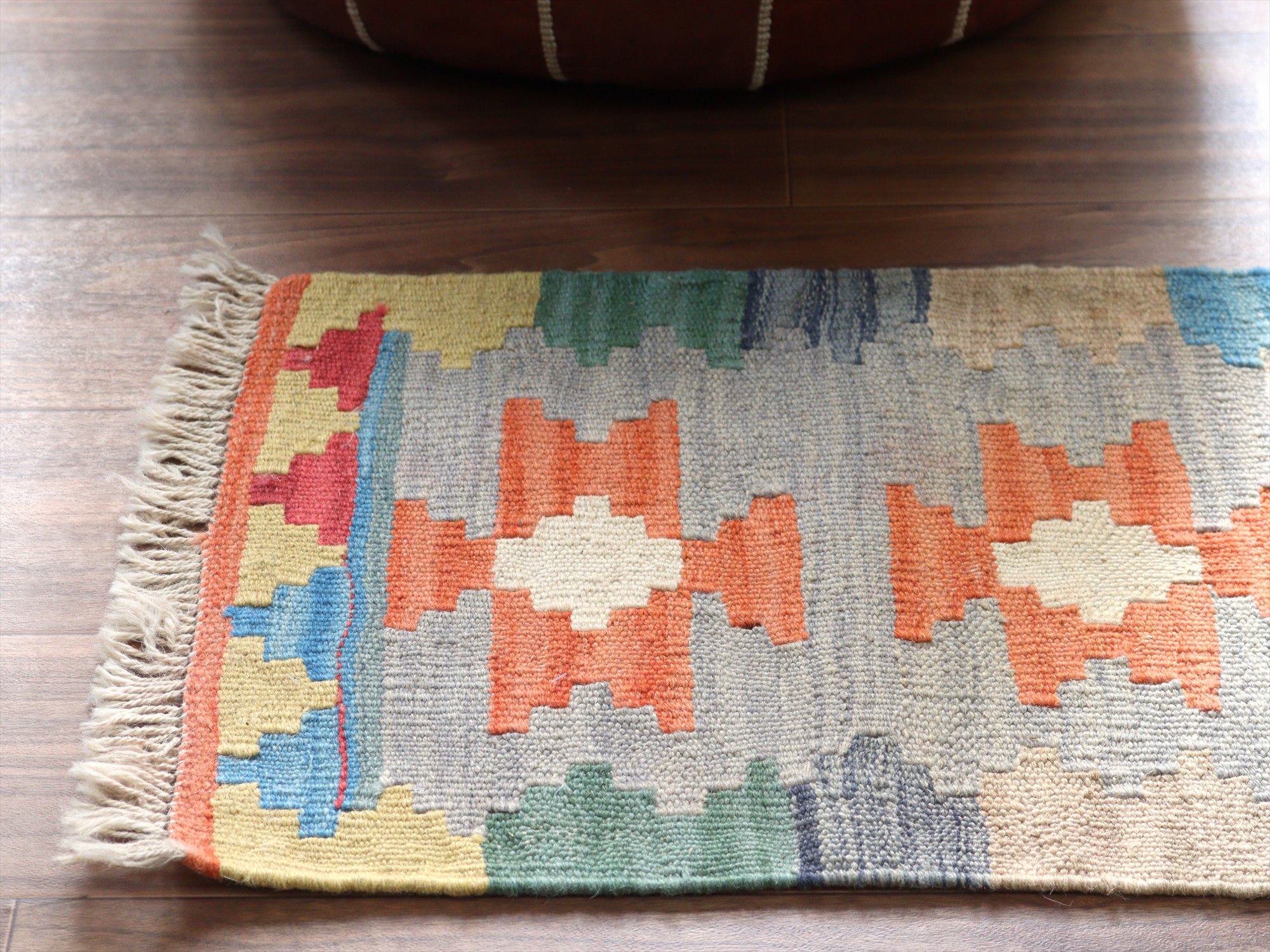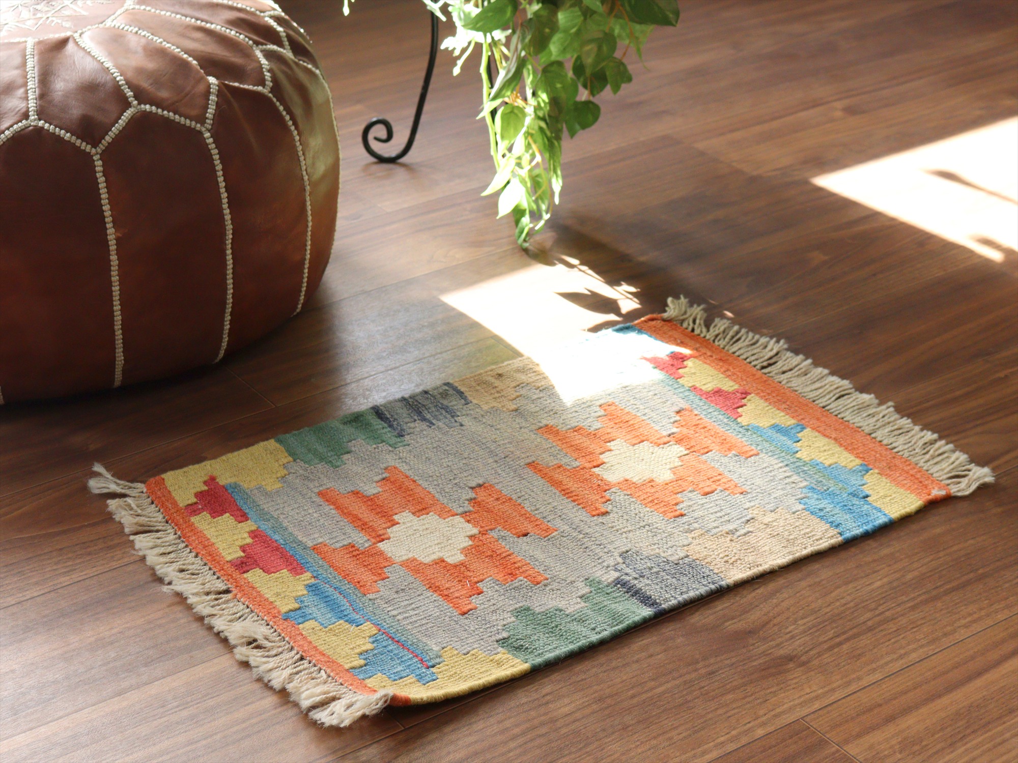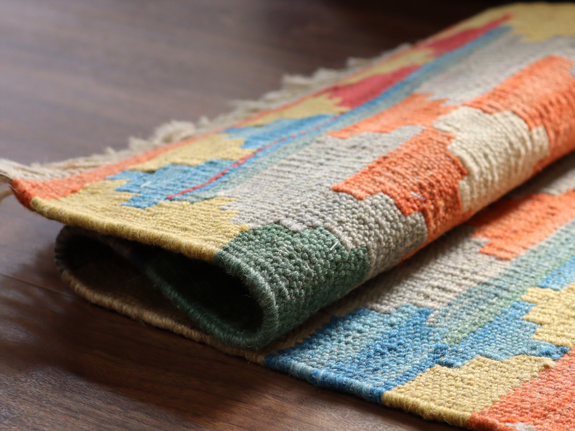 | しっかりとしたハリのある織りで、厚みは4mm前後。多少カタチがゆがみがありますが、手織りキリムならではの味わいとご理解ください。 |
