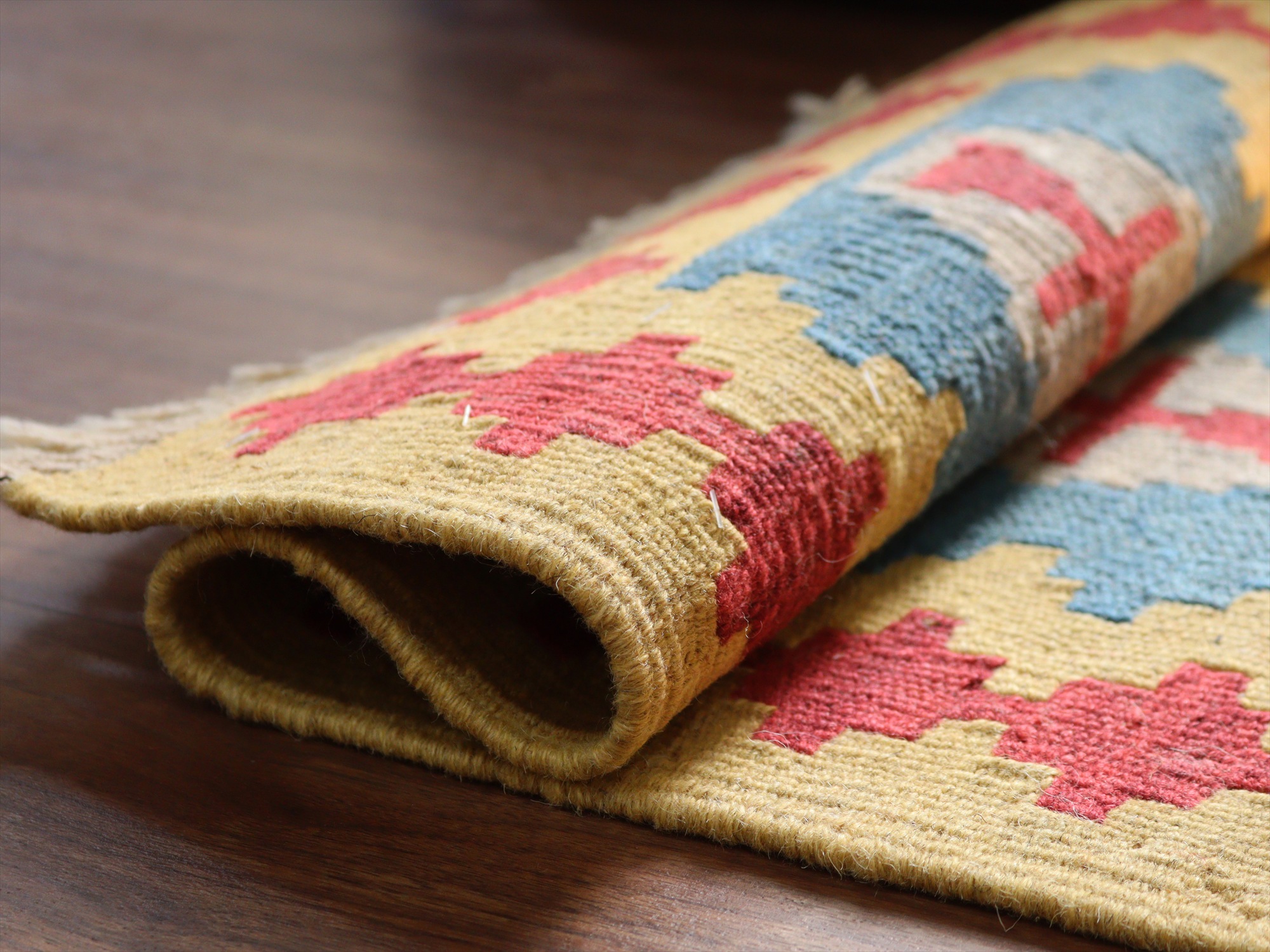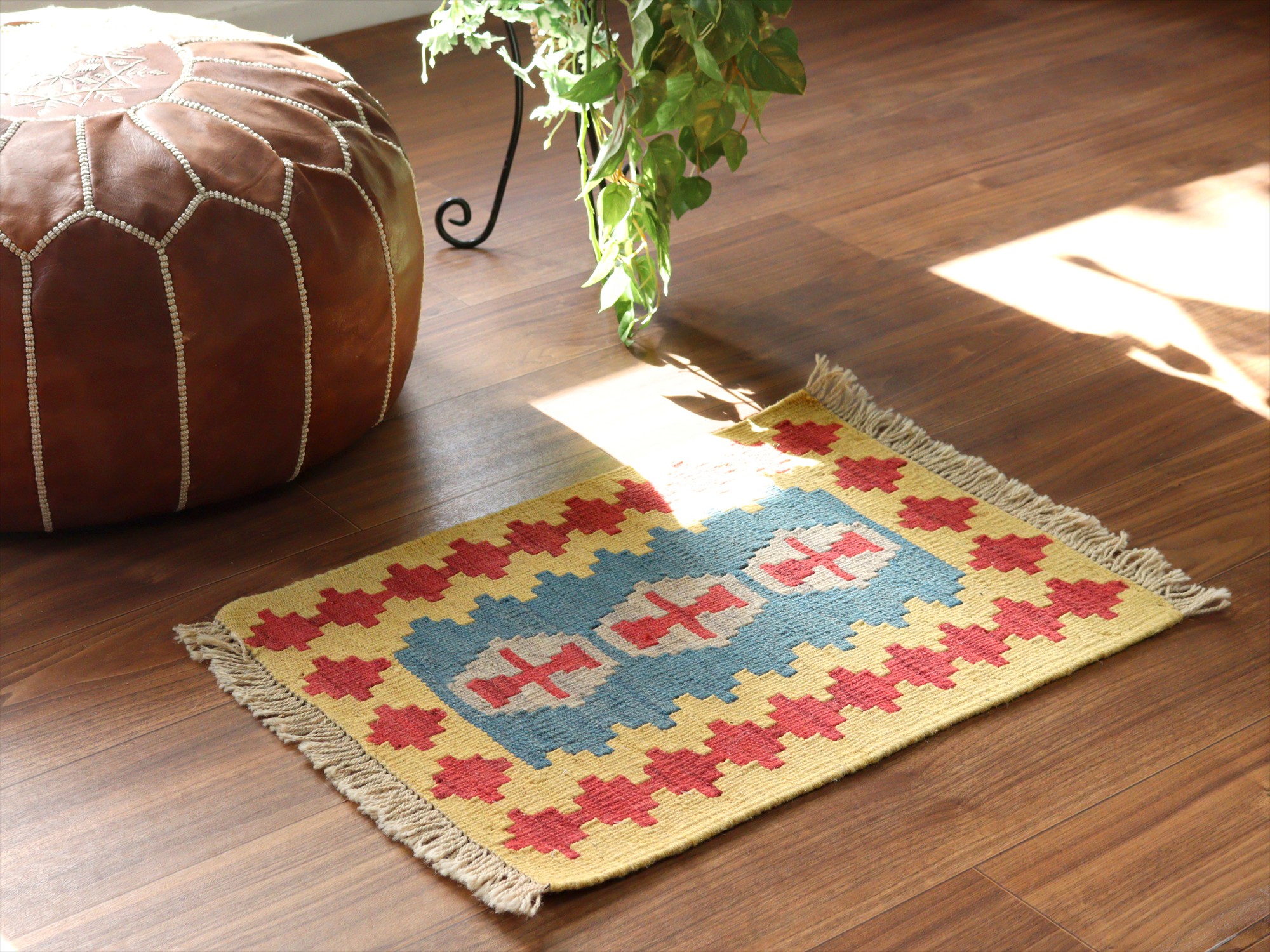 | しっかりとしたハリのある織りで、厚みは4mm前後。多少カタチがゆがみがありますが、手織りキリムならではの味わいとご理解ください。 |