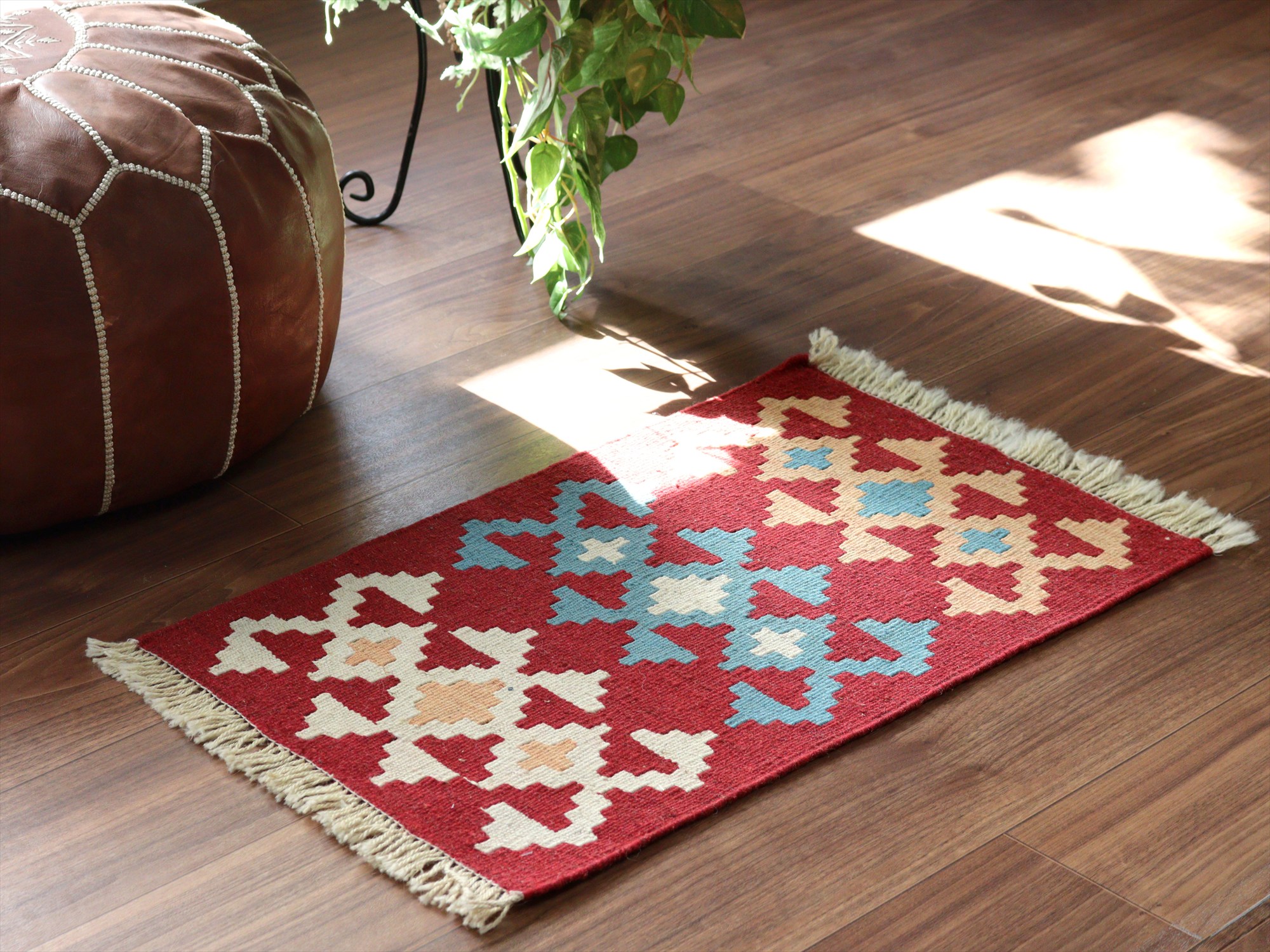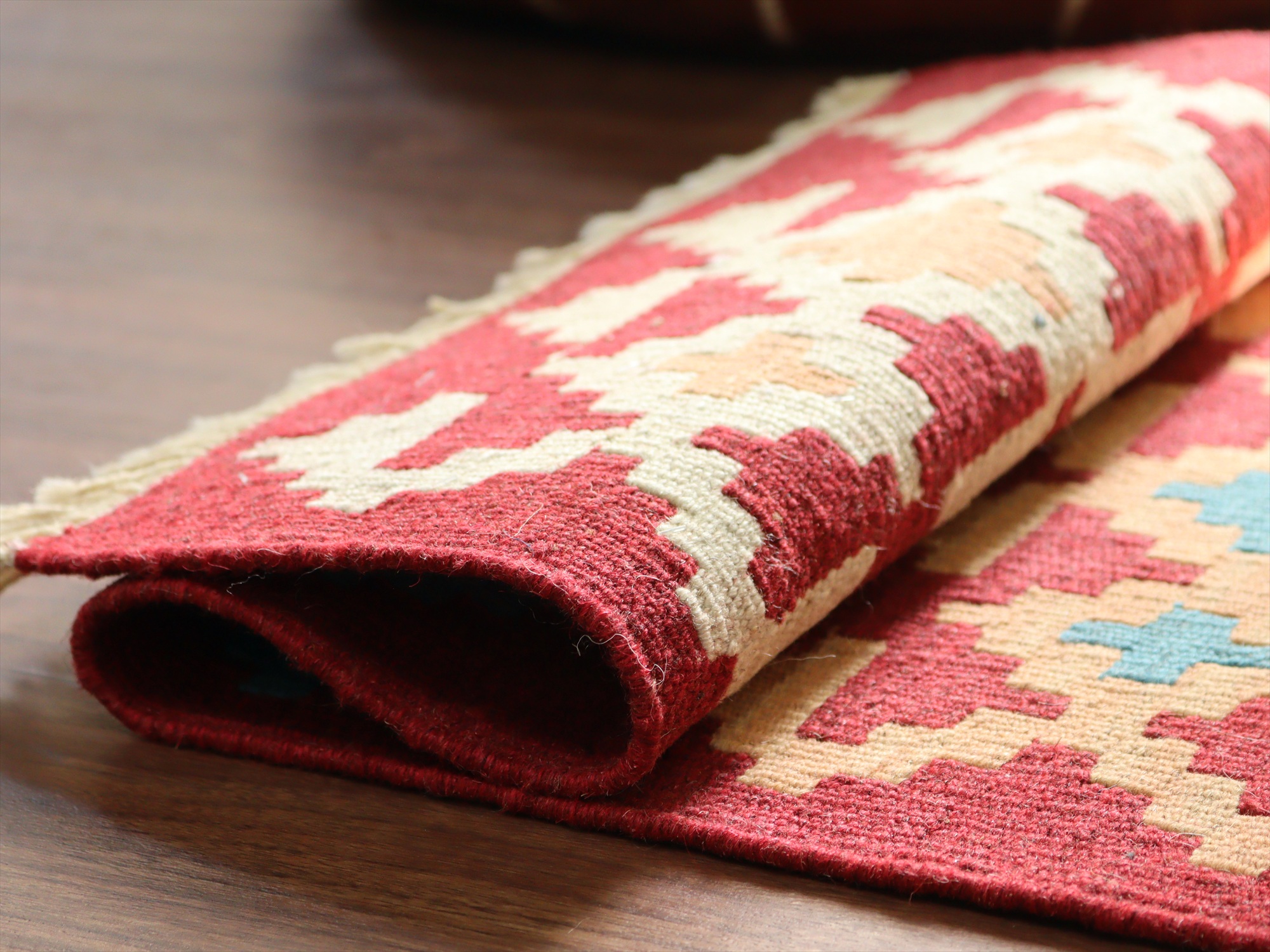 | しっかりとしたハリのある織りで、厚みは4mm前後。多少カタチがゆがみがありますが、手織りキリムならではの味わいとご理解ください。 |