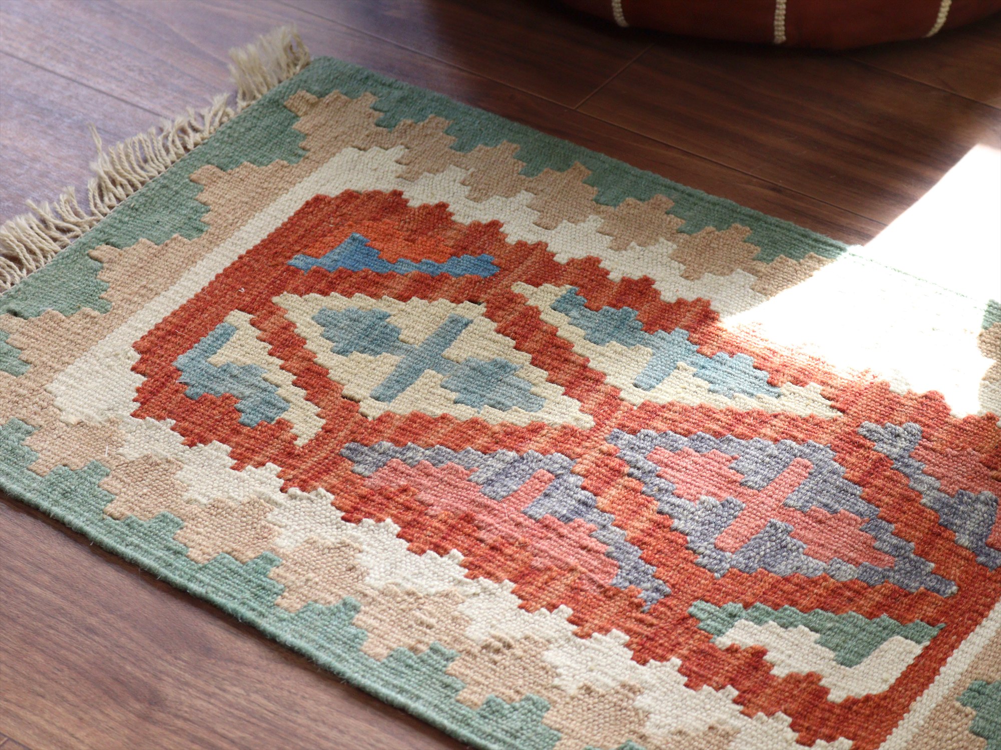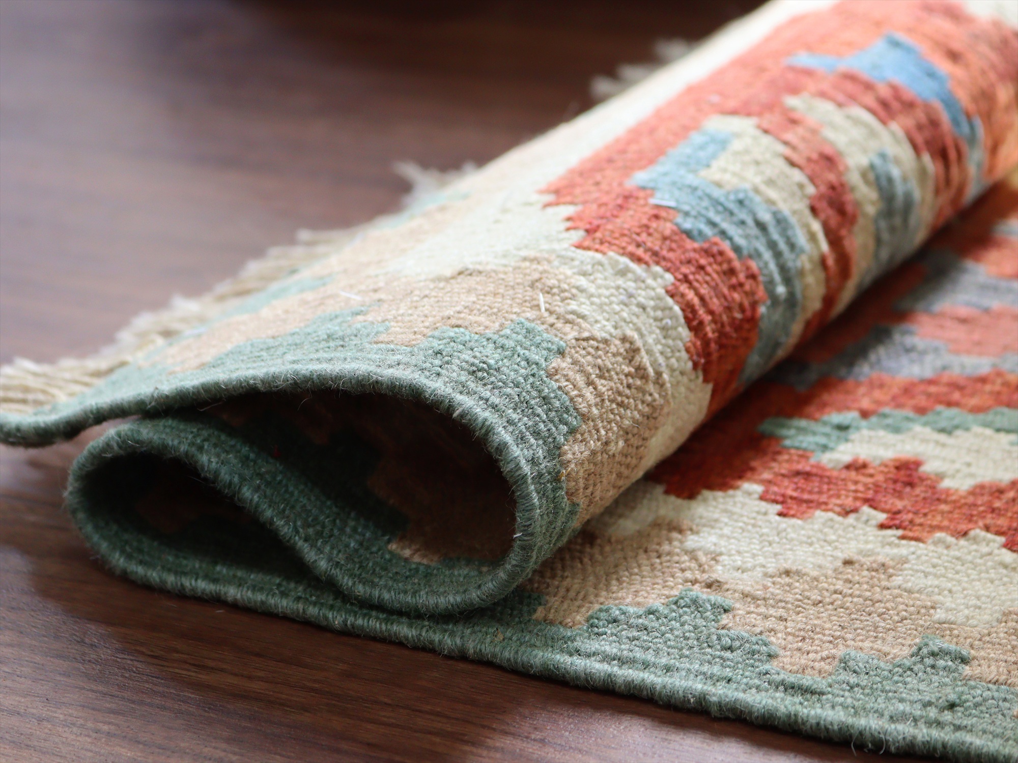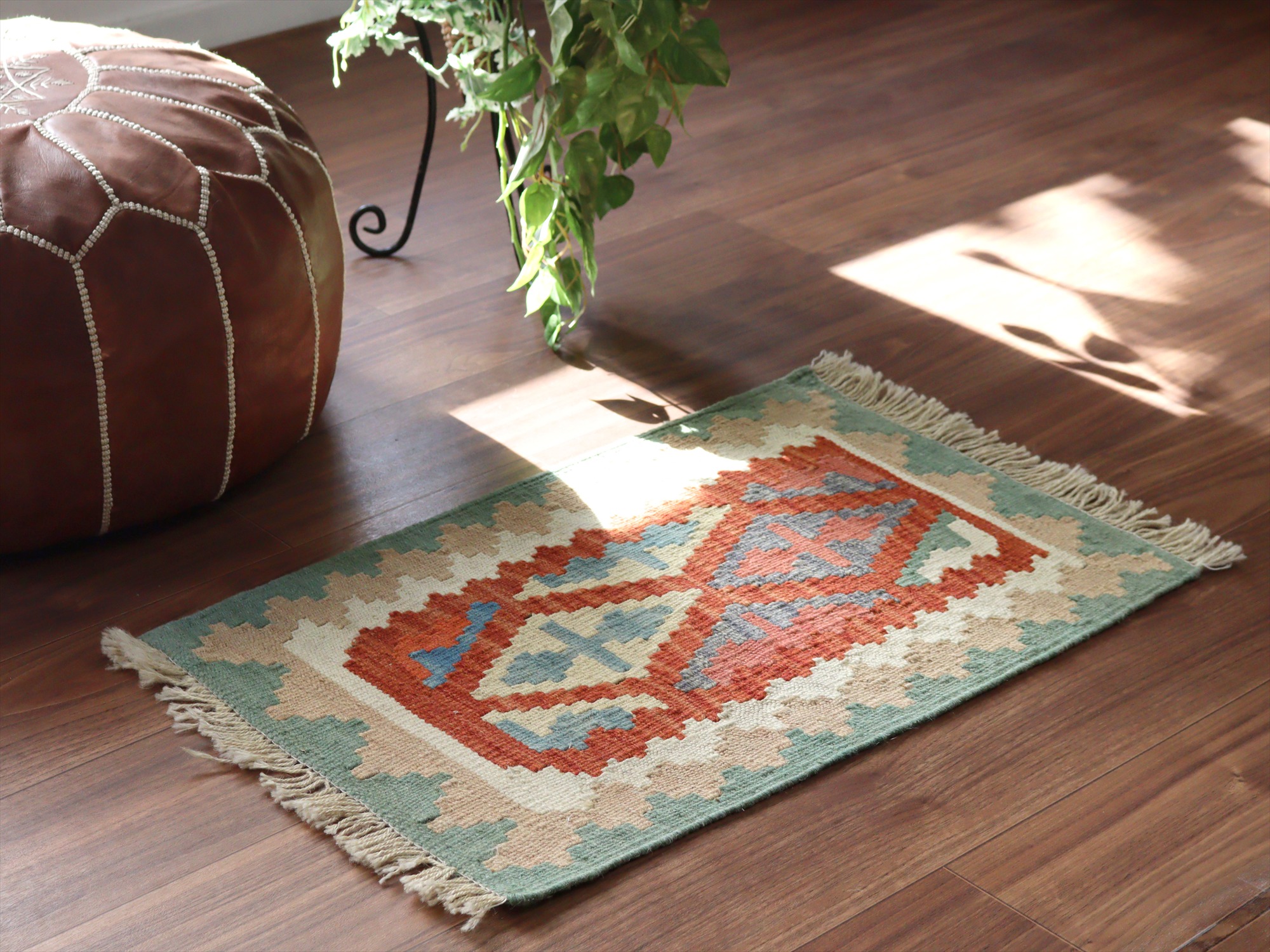 | しっかりとしたハリのある織りで、厚みは4mm前後。多少カタチがゆがみがありますが、手織りキリムならではの味わいとご理解ください。 |