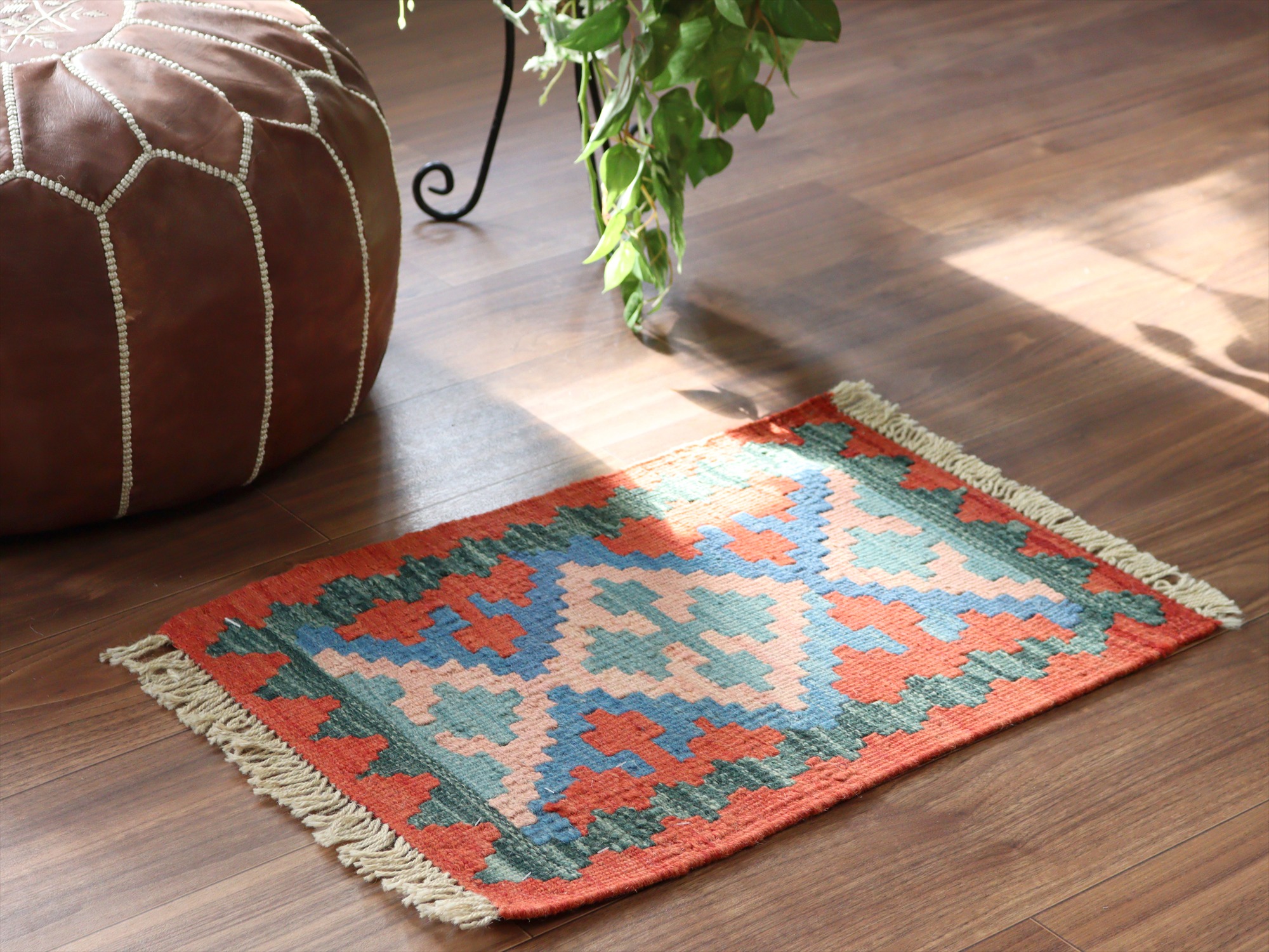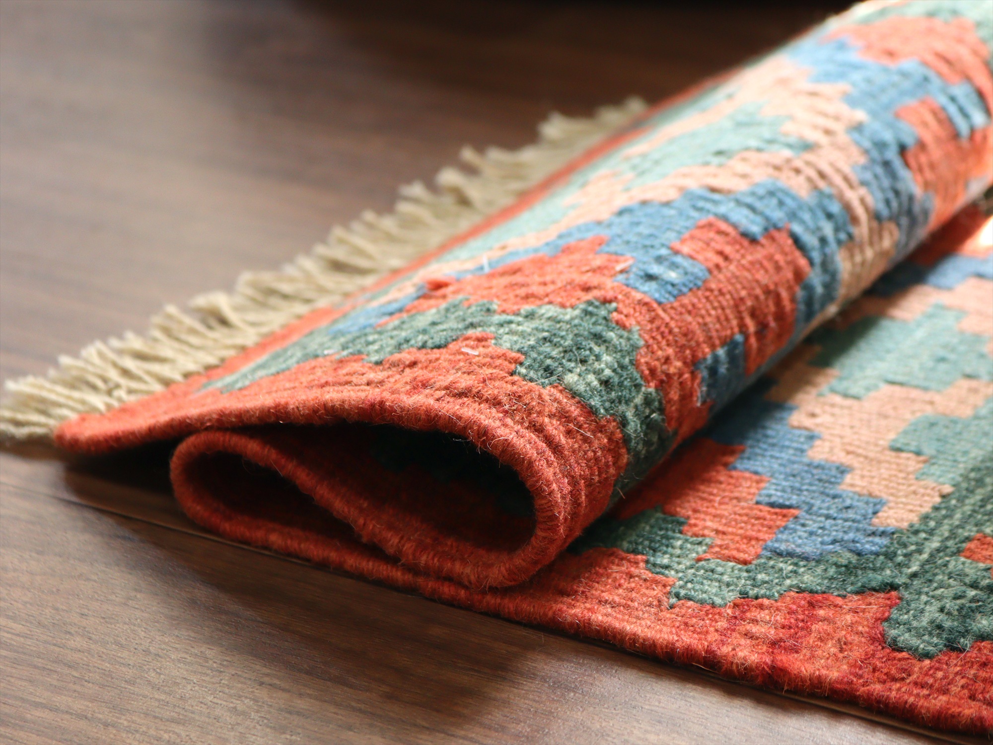 | しっかりとしたハリのある織りで、厚みは4mm前後。多少カタチがゆがみがありますが、手織りキリムならではの味わいとご理解ください。 |
