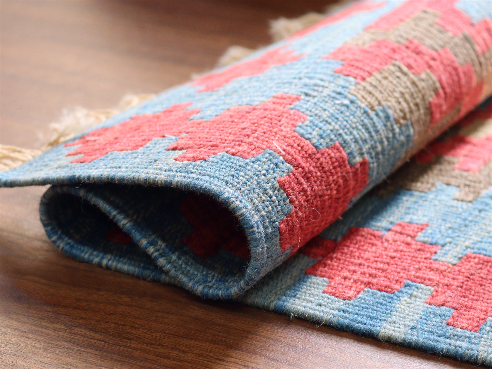 | しっかりとしたハリのある織りで、厚みは4mm前後。多少カタチがゆがみがありますが、手織りキリムならではの味わいとご理解ください。 |