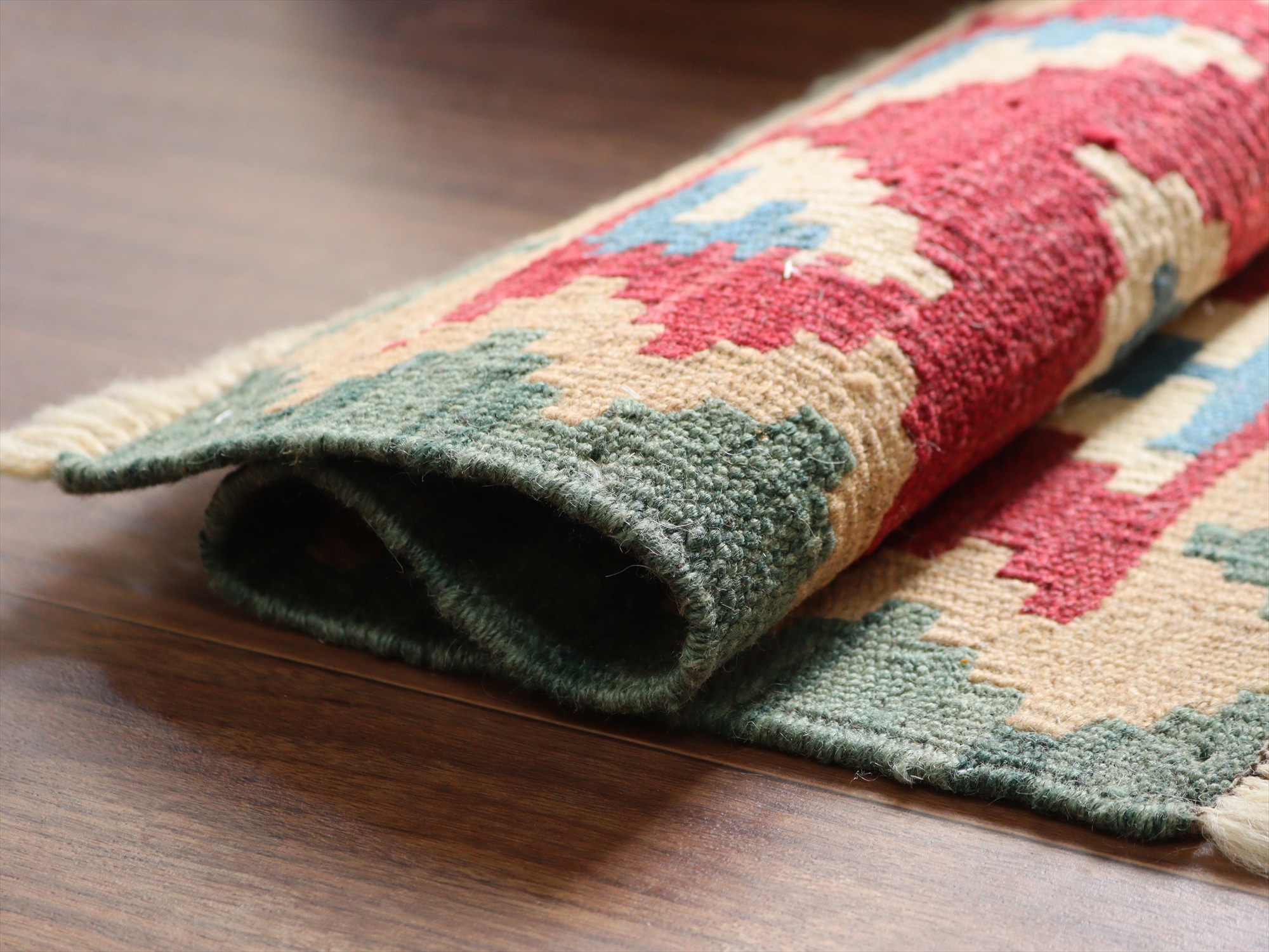 | しっかりとしたハリのある織りで、厚みは4mm前後。多少カタチがゆがみがありますが、手織りキリムならではの味わいとご理解ください。 |