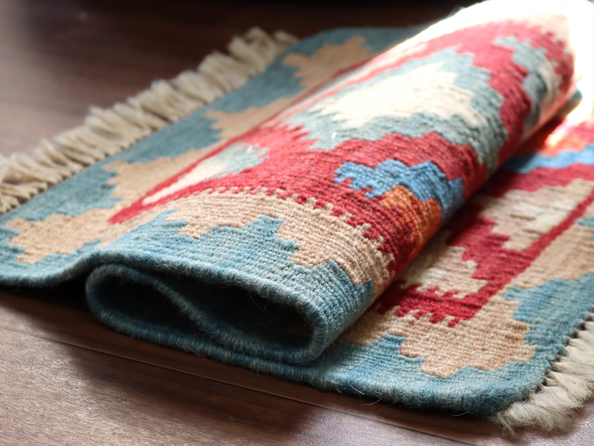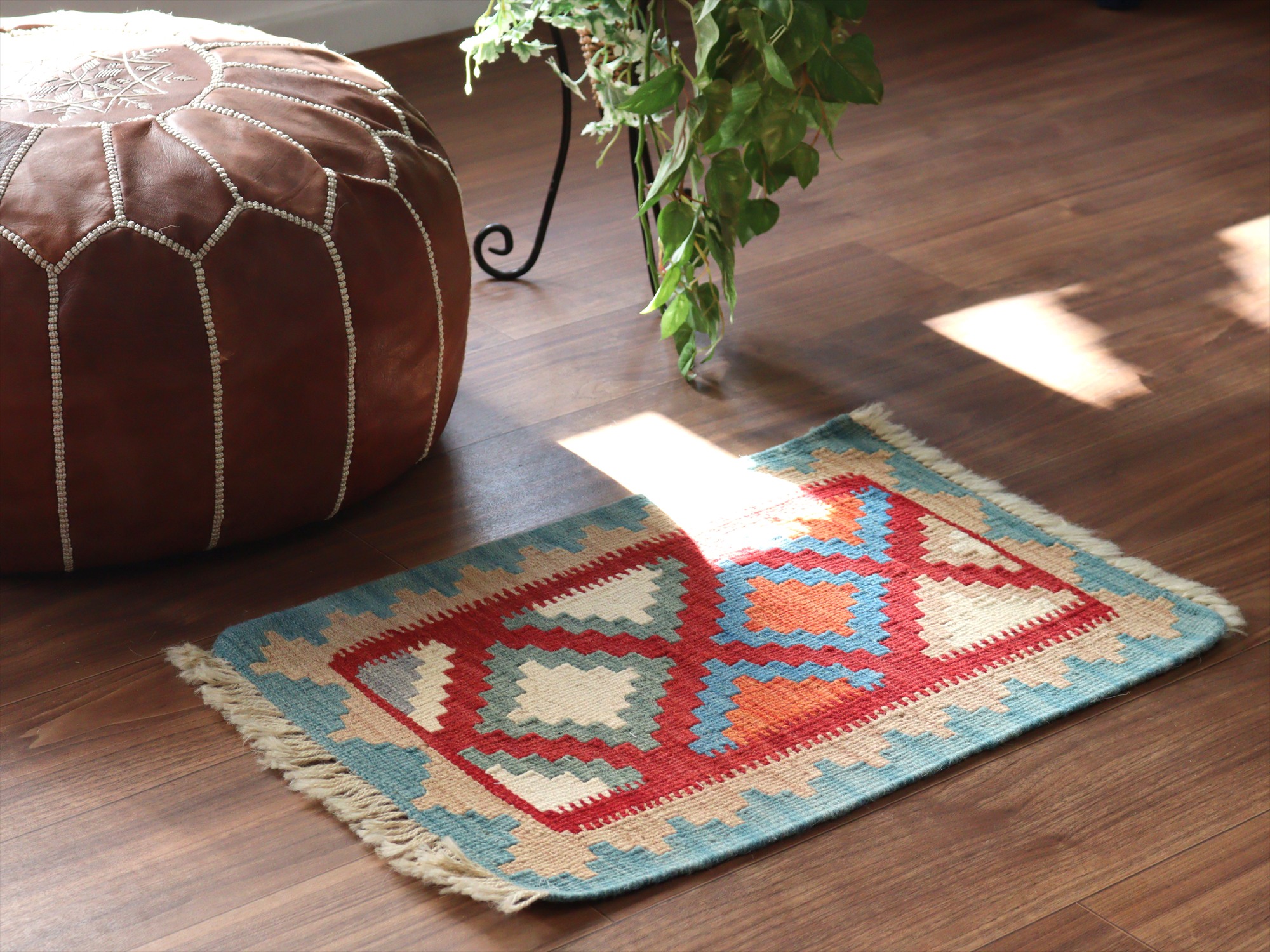 | しっかりとしたハリのある織りで、厚みは4mm前後。多少カタチがゆがみがありますが、手織りキリムならではの味わいとご理解ください。 |