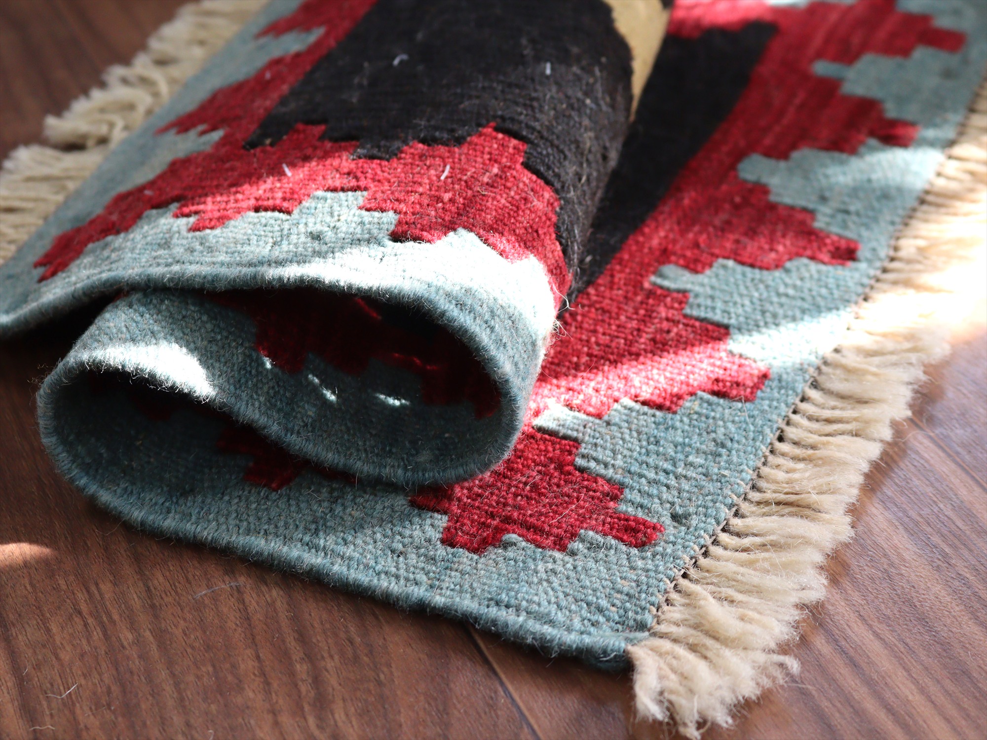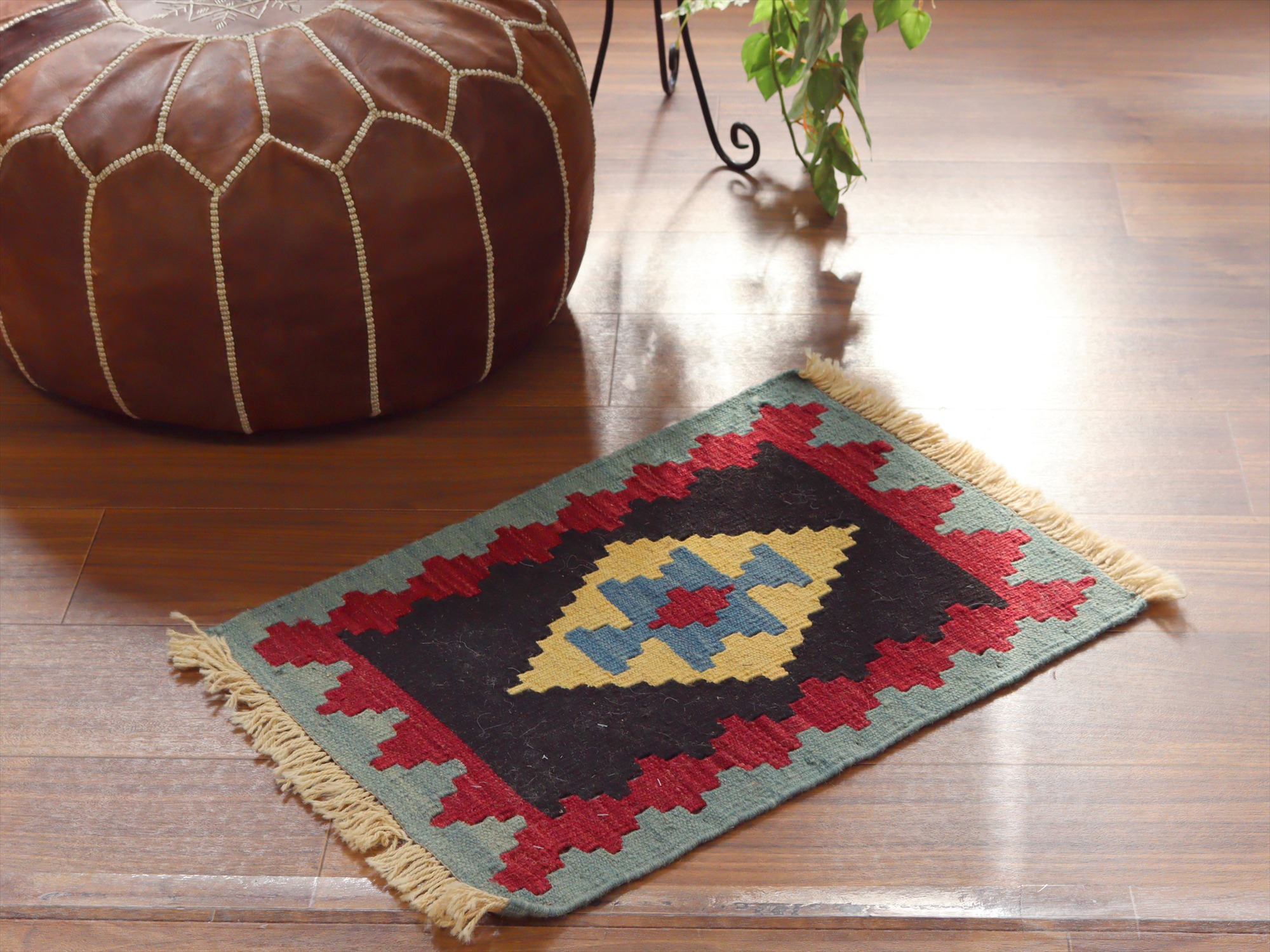 | しっかりとしたハリのある織りで、厚みは4mm前後。多少カタチがゆがみがありますが、手織りキリムならではの味わいとご理解ください。 |