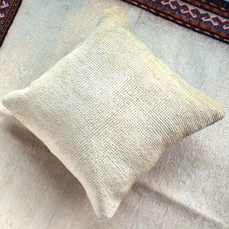 | 長い間家庭で使われていたり、ダメージがあったりする手織りカーペットを使っているため、表面のパイルはすり減って結び目が見えている部分やなどがあります。クッションに加工する前には、きれいに水洗いされています。 |