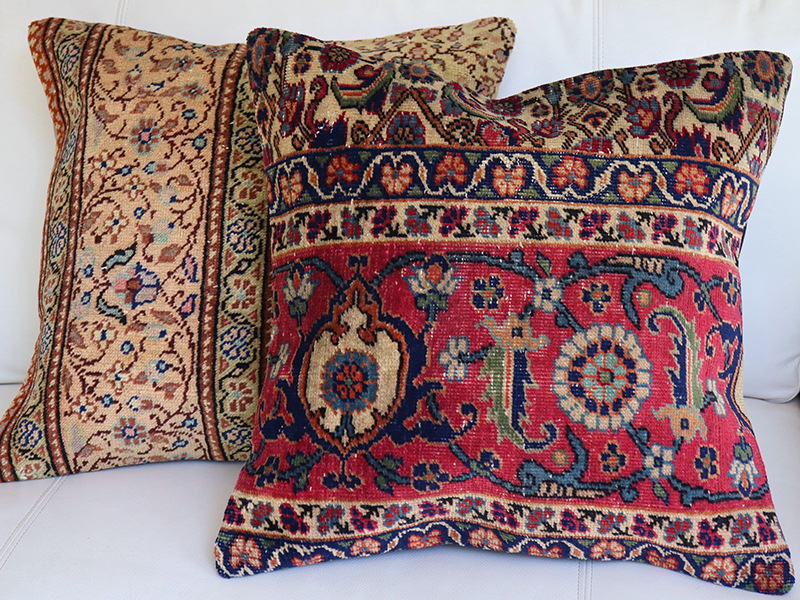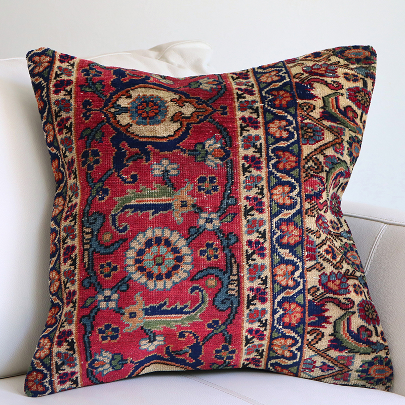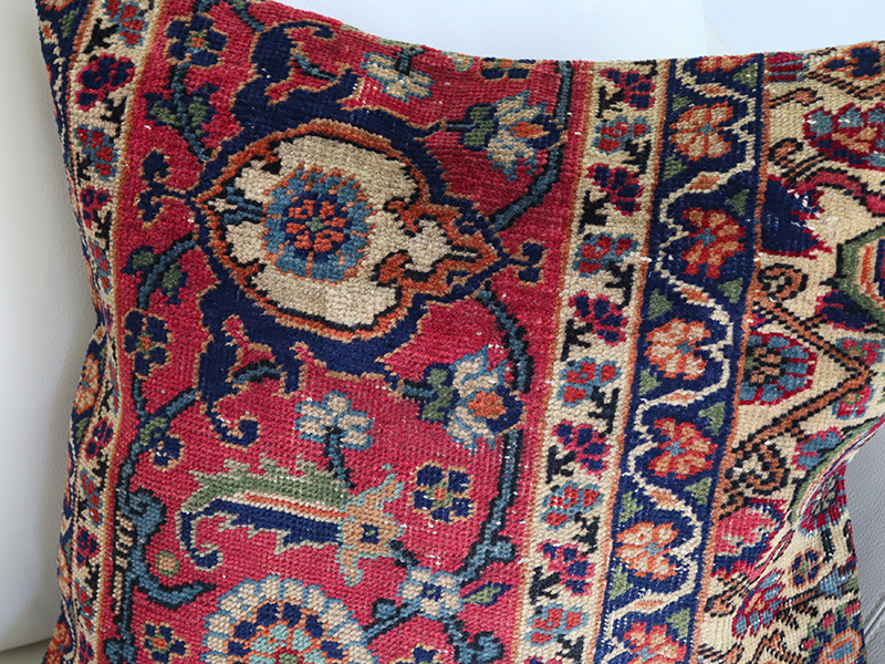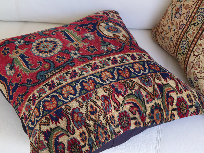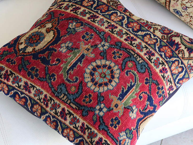 | オールドカーペットのクッションは、長い間家庭で使われていたり、ダメージがあったりする手織りカーペットを使っているため、表面のパイルはすり減って結び目が見えている部分などがあります。クッションに加工する前には、きれいに水洗いされています。 |