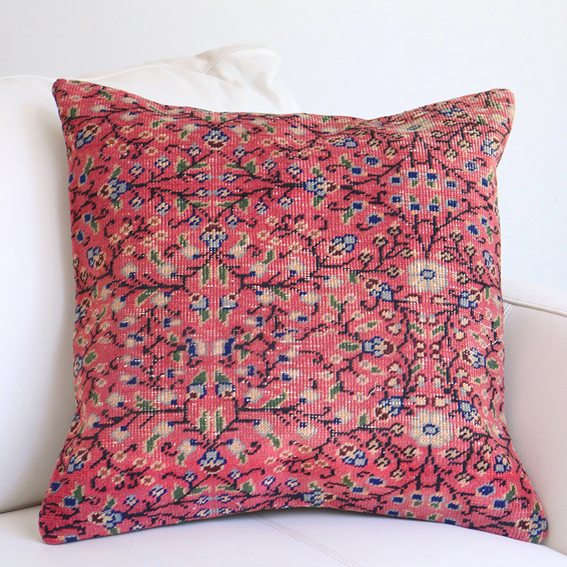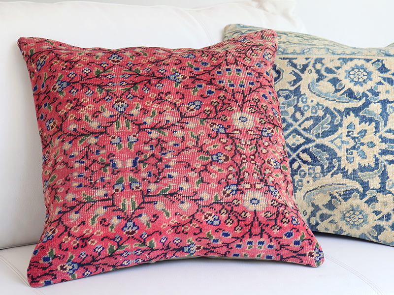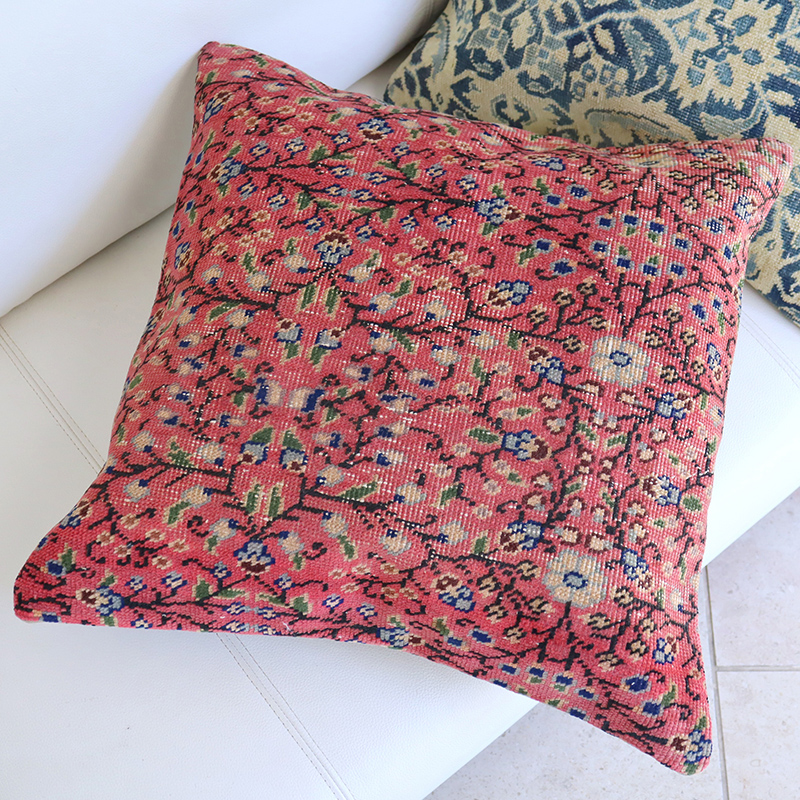 | オールドカーペットのクッションは、長い間家庭で使われていたり、ダメージがあったりする手織りカーペットを使っているため、表面のパイルはすり減って結び目が見えている部分などがあります。クッションに加工する前には、きれいに水洗いされています。 |