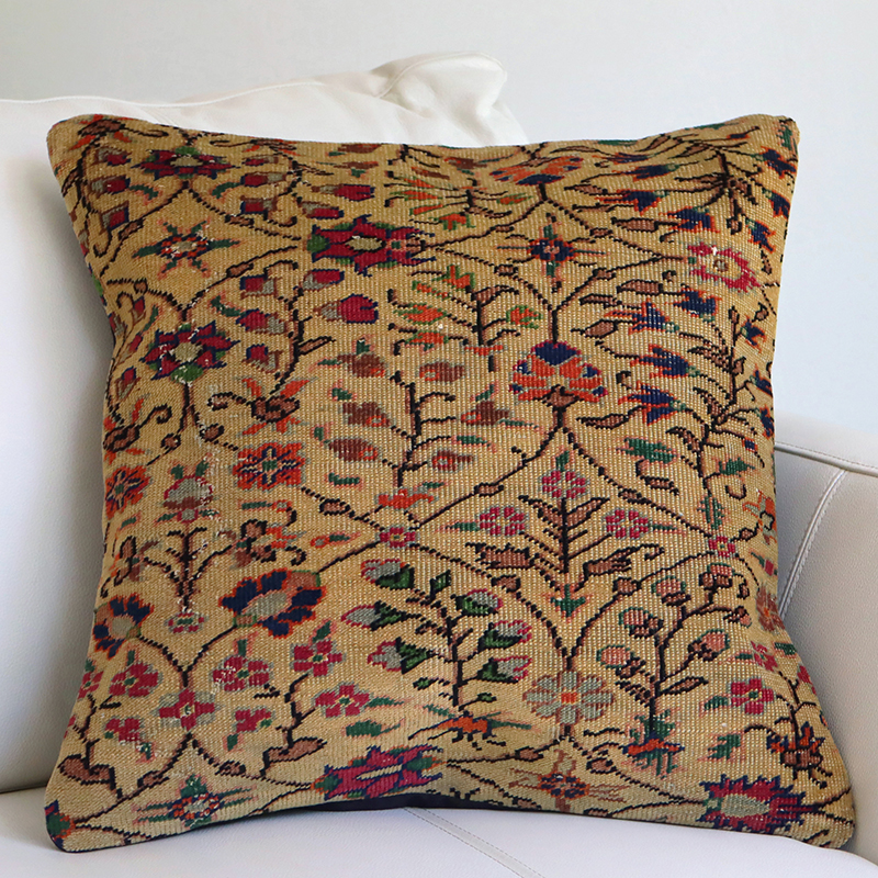 - ヴィンテージ・絨毯クッション 45cm角 トルコ絨毯・カイセリ アイボリー 緻密に織られたフラワーモチーフ