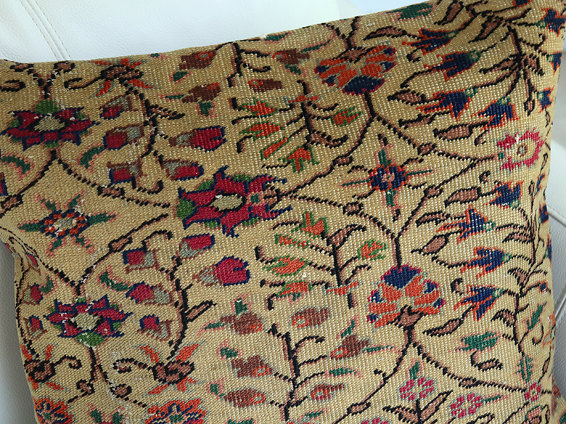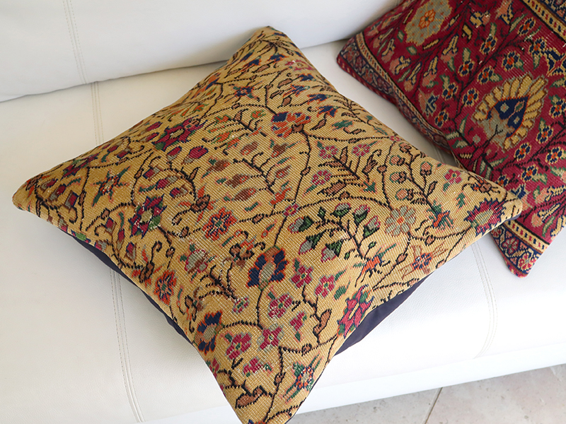 | オールドカーペットのクッションは、長い間家庭で使われていたり、ダメージがあったりする手織りカーペットを使っているため、表面のパイルはすり減って結び目が見えている部分などがあります。クッションに加工する前には、きれいに水洗いされています。 |