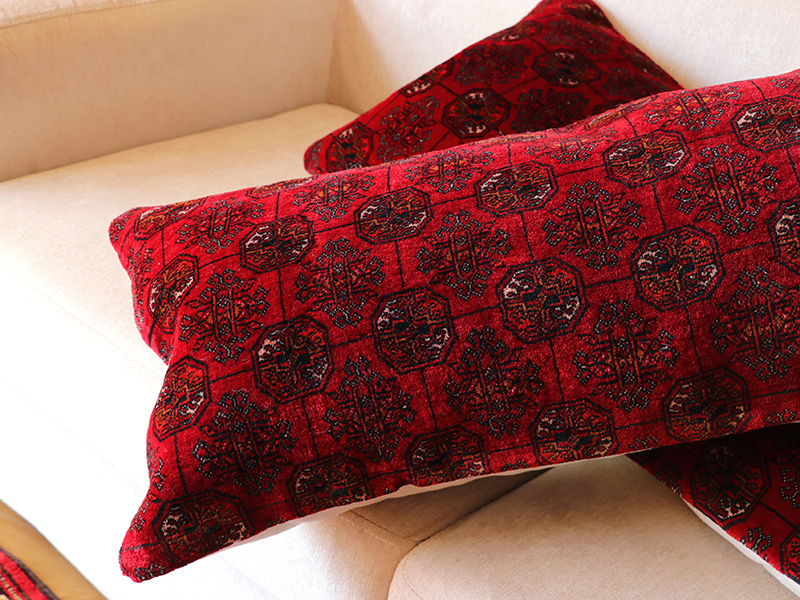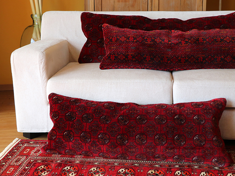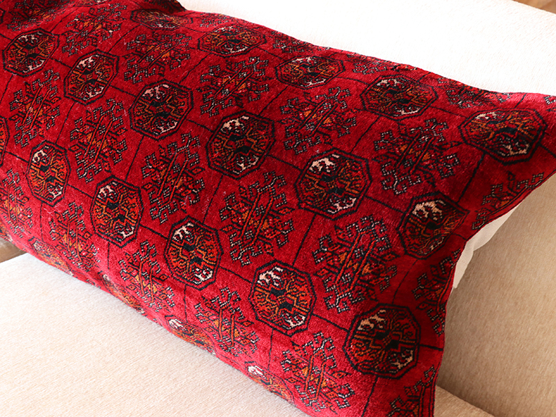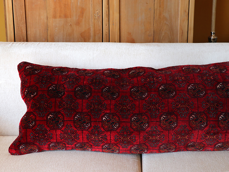 | アフガニスタン北部で織られている、とても細かな織りの手織りじゅうたんからのカット。パイルはビロードのよう光沢があってなめらかな肌触りです。とても目のつまった織り地で、濃い深みのある色合いが魅力的です。 ベッドヘッドに、枕と並べて置くのに調度よいサイズのクッションとしてつくられました。細長なので2人掛けのソファに腰あてとして置いてもよさそうです。 |