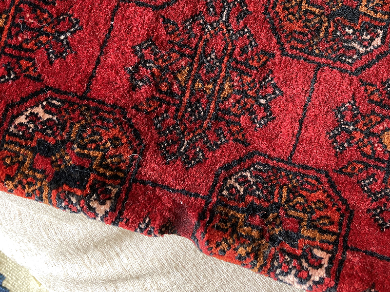 | 目のつまった織り地です。表面はとてもなめらかで、やさしい肌ざわり。一部パイルがなくなっている部分があり、家庭の修理が入っています。 中綿は付いていません。中綿を希望される場合はお見積りいたしますのでお問合せください。 |