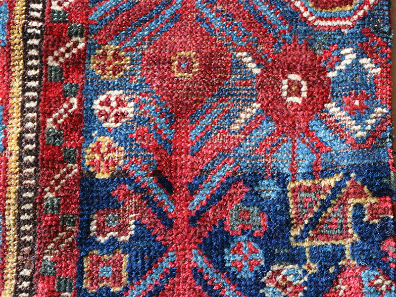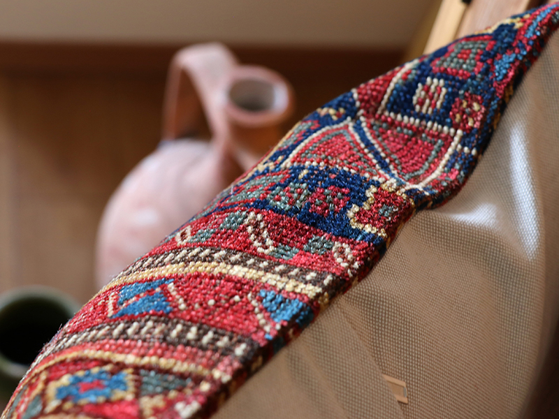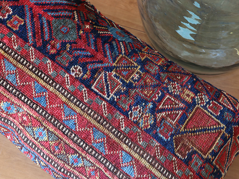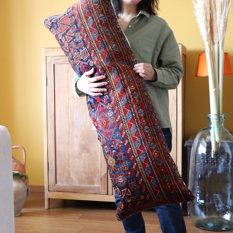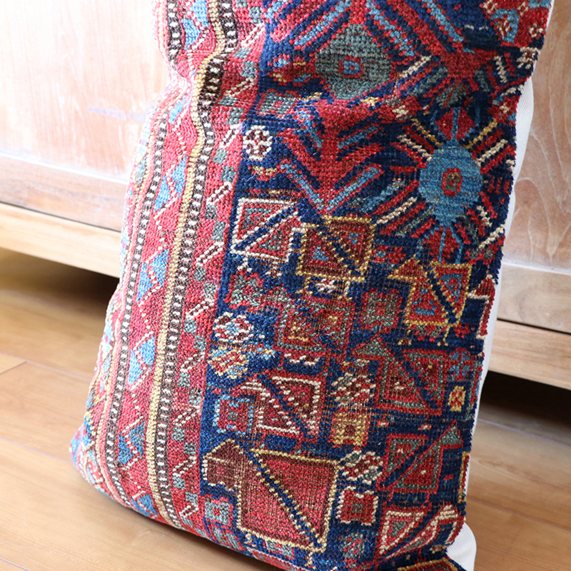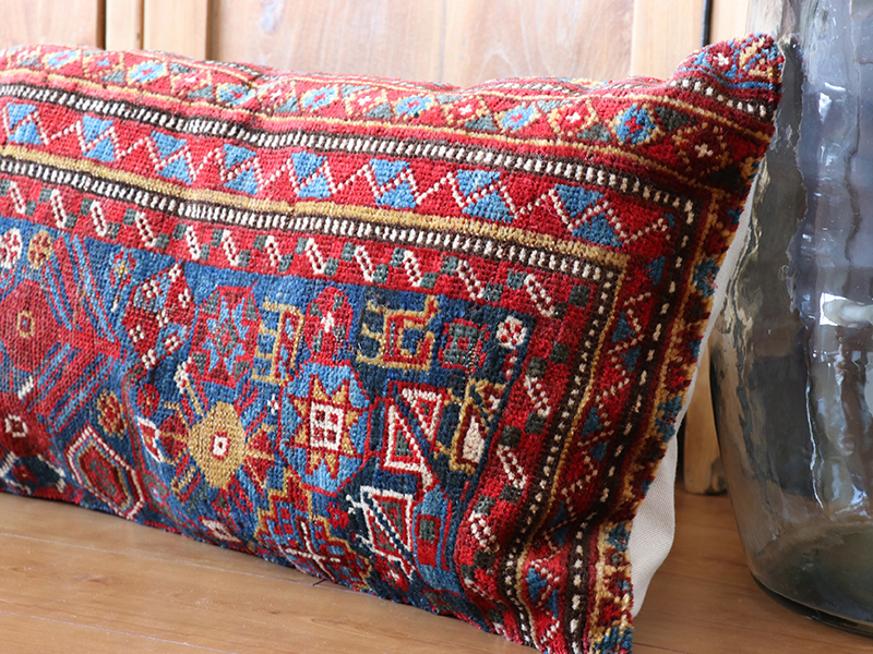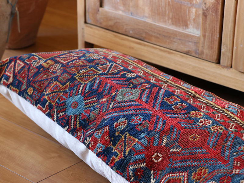| とてもきれいな色あいのオールドカーペットからのカット。織られてから100年以上は経っている、コレクションにもおすすめのピースです。 ベッドヘッドに、枕と並べて置くのに調度よいサイズのクッションとしてつくられました。細長なので2人掛けのソファに腰あてとして置いてもよさそうです。 |