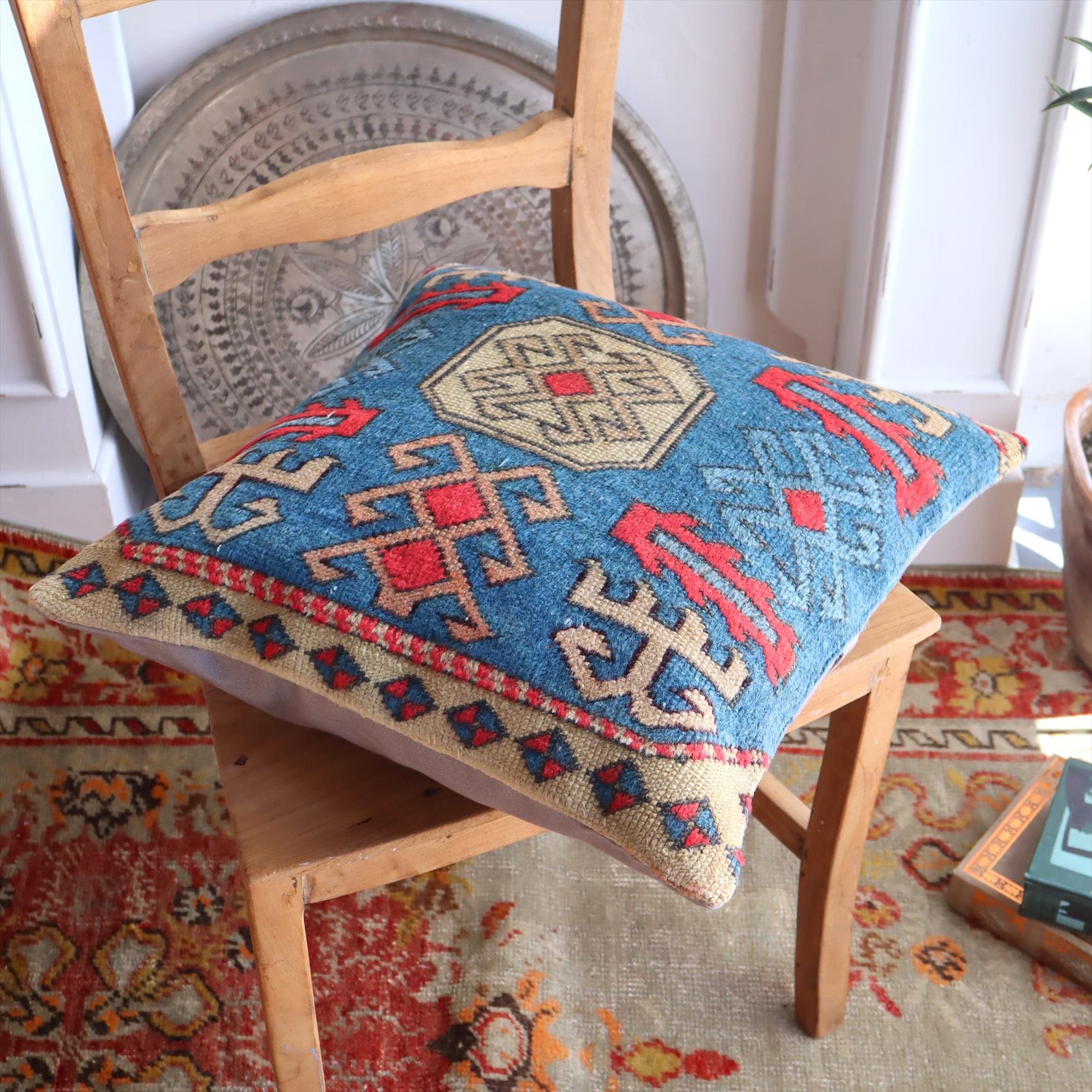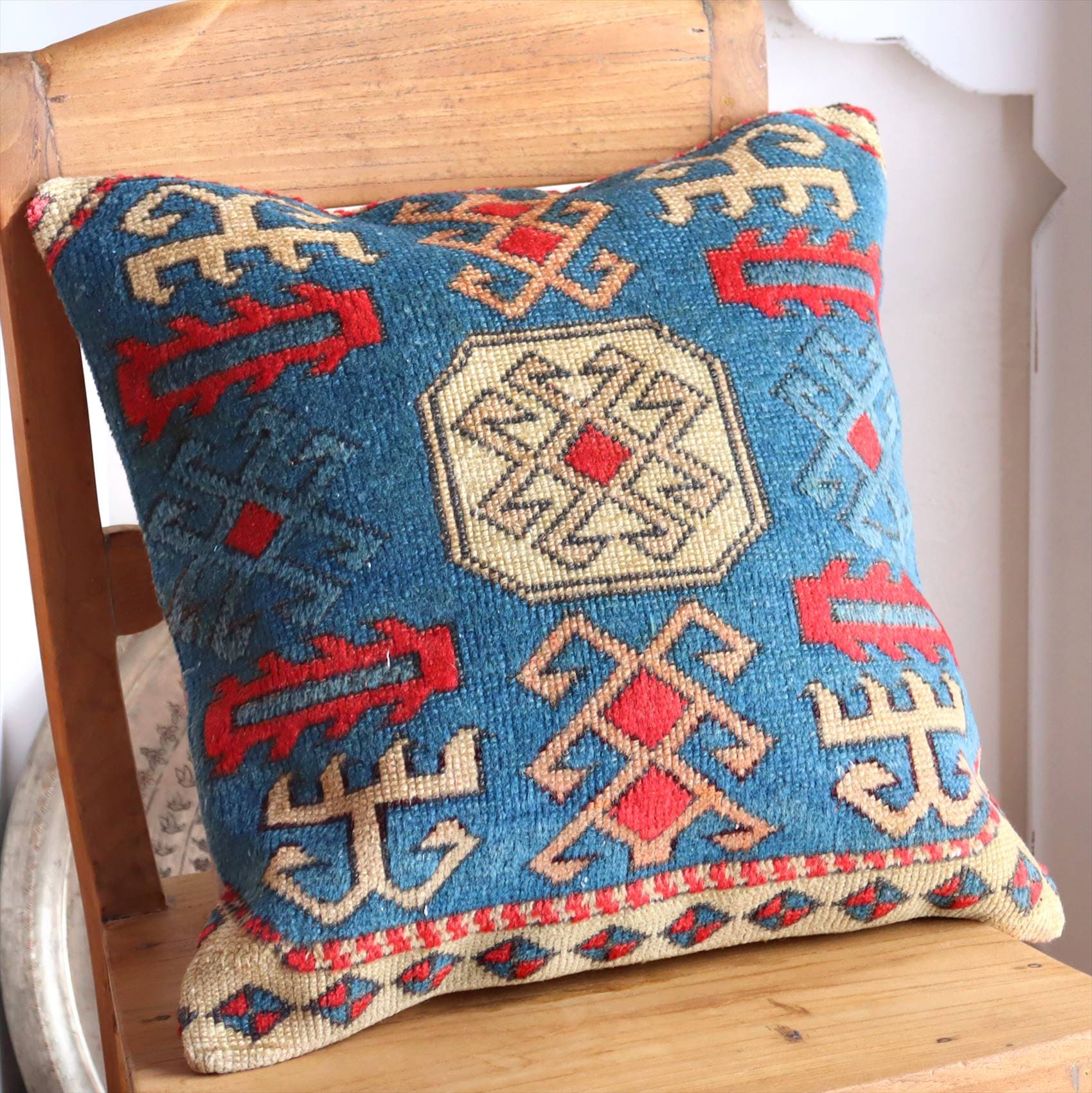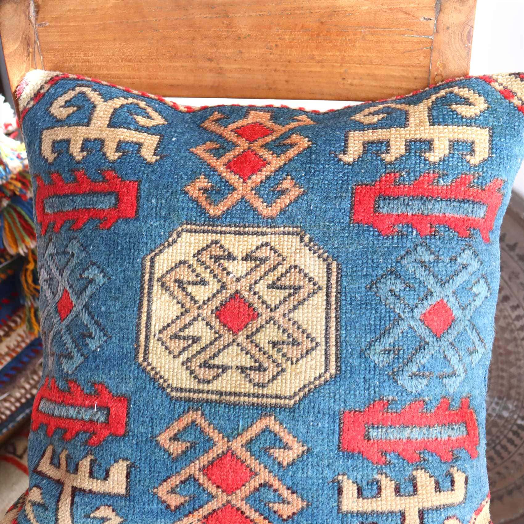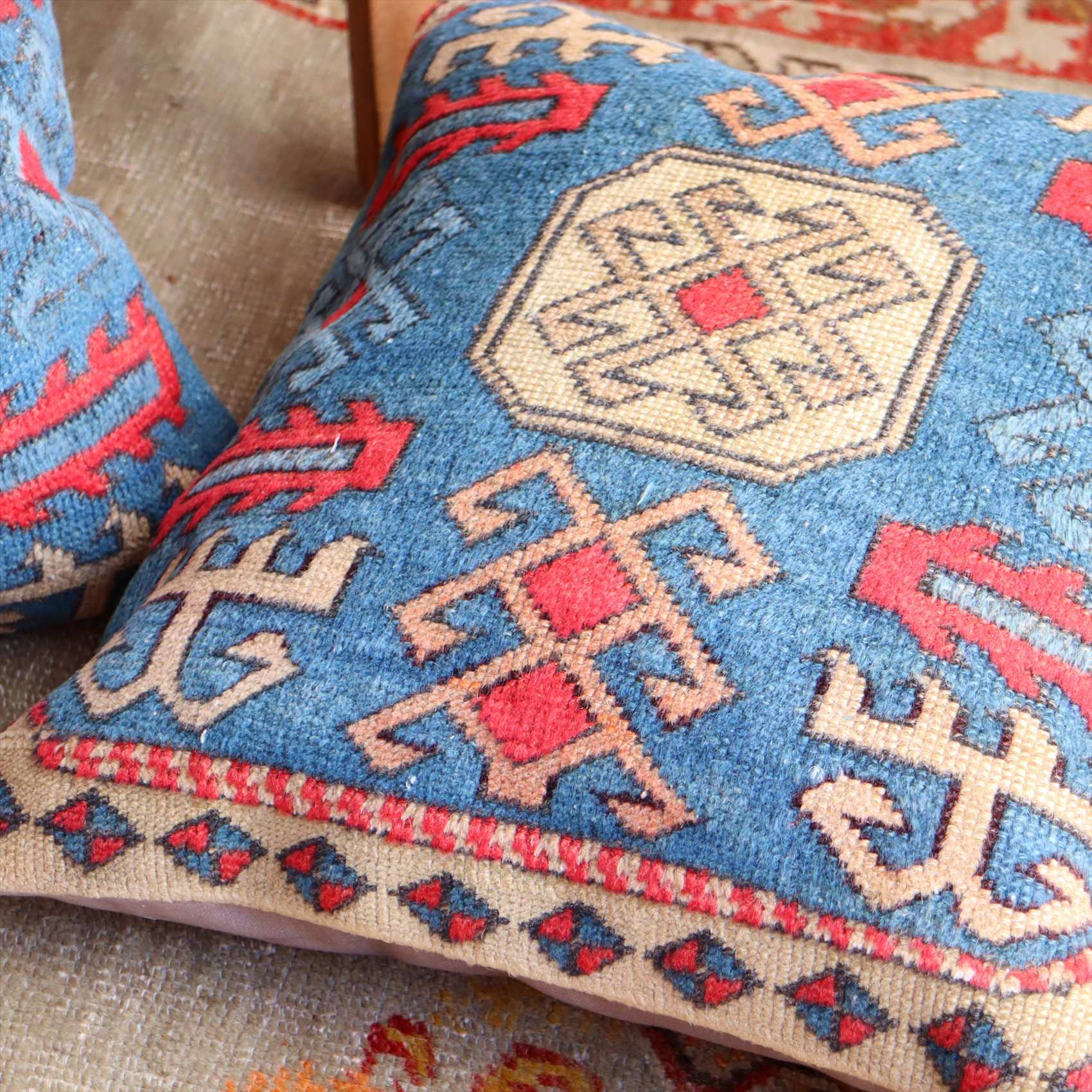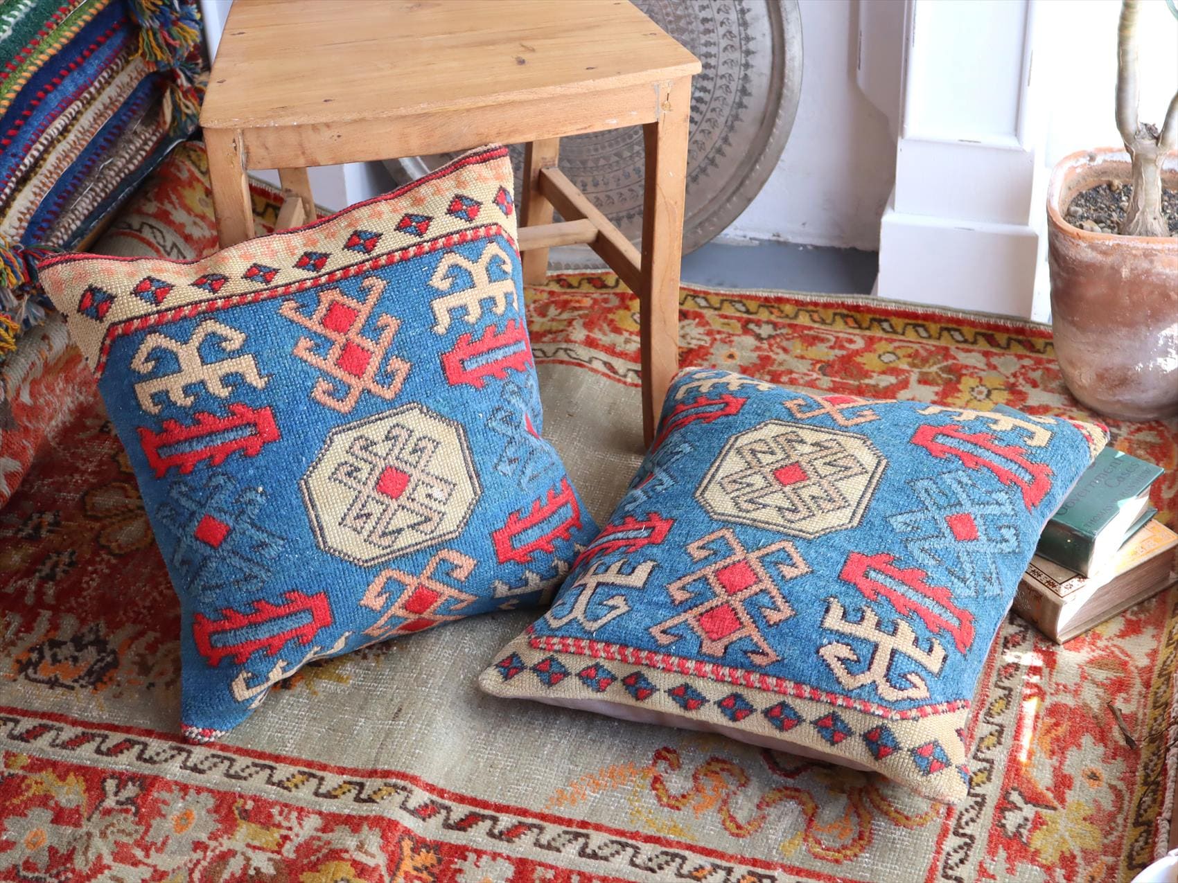 | オールドカーペットのクッションは、長い間家庭で使われていたり、ダメージがあったりする手織りカーペットを使っているため、表面のパイルはすり減って結び目が見えている部分などがあります。クッションに加工する前には、きれいに水洗いされています。 |