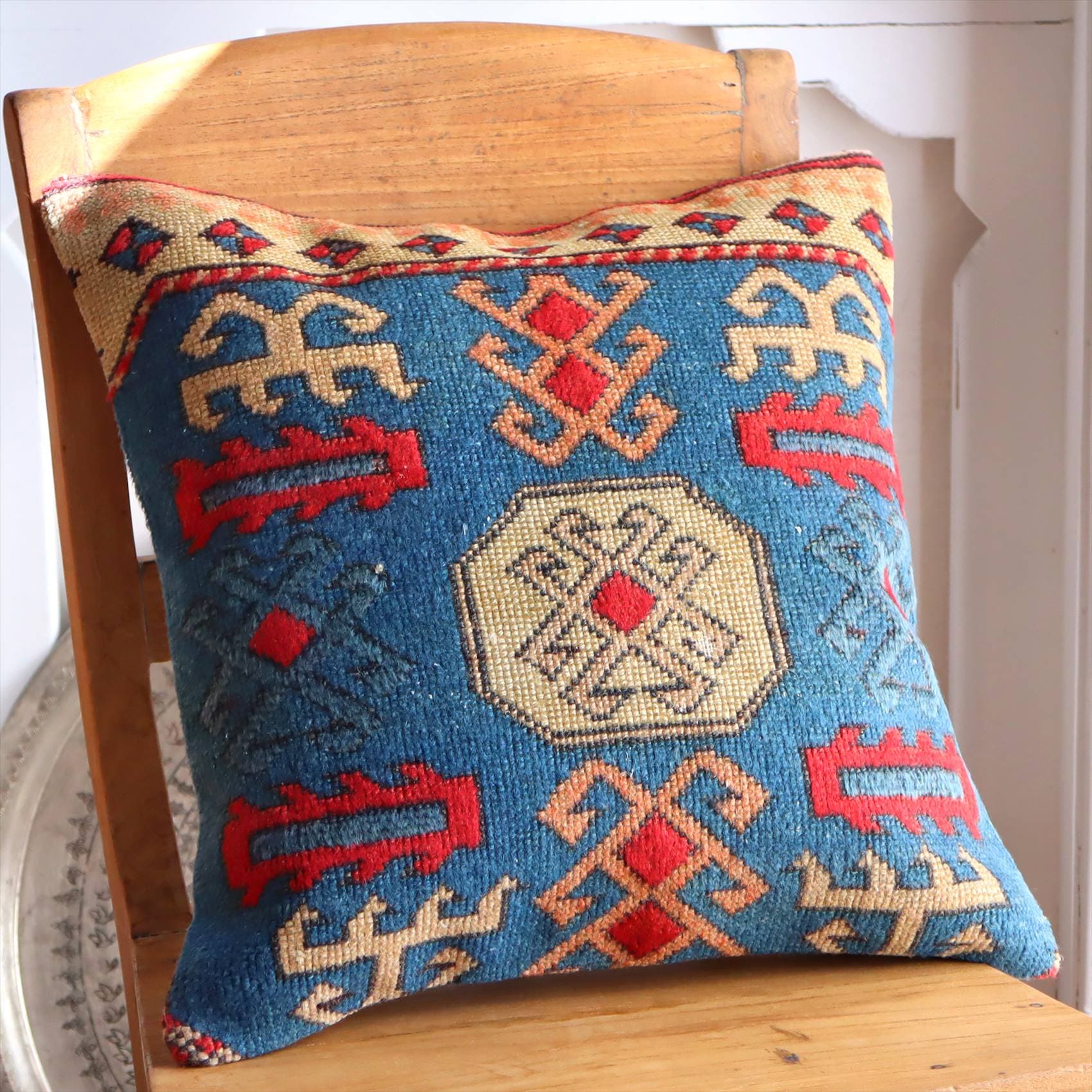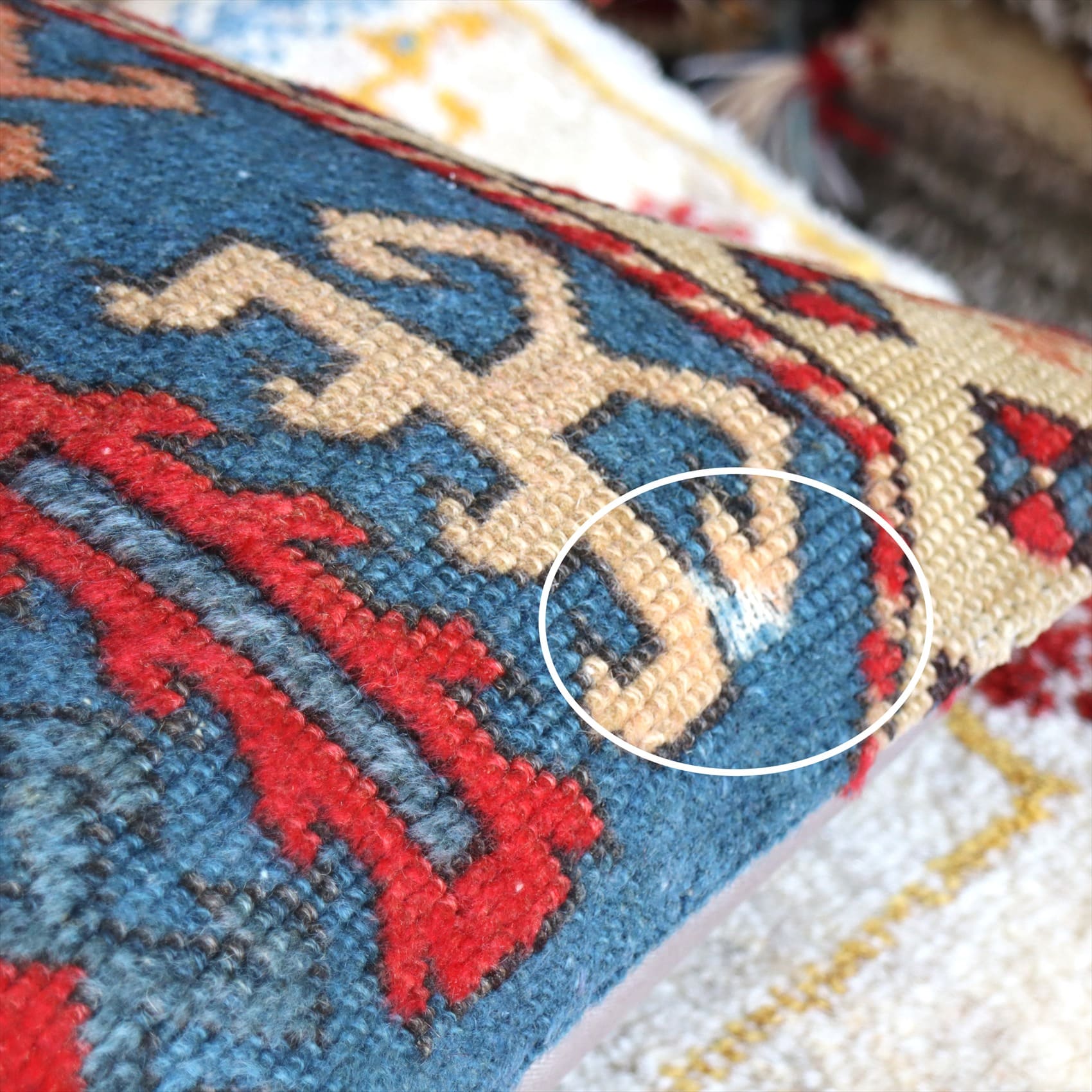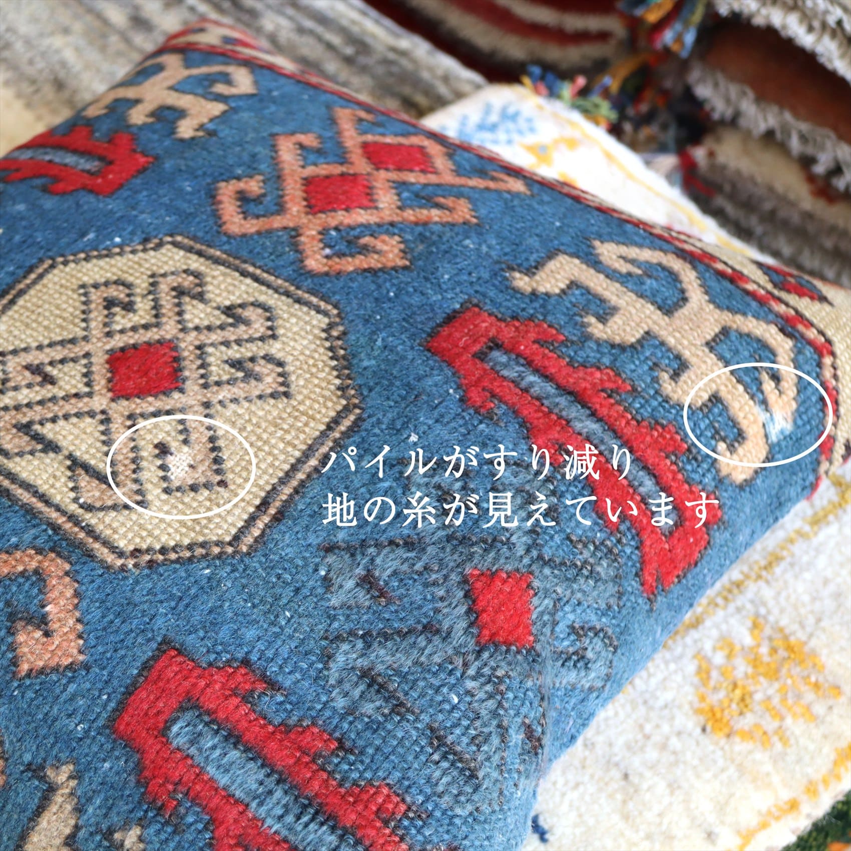 | パイルのすり減りが大きく、地の糸が見えている部分が2か所あります。 オールドカーペットのクッションは、長い間家庭で使われていたり、ダメージがあったりする手織りカーペットを使っているため、表面のパイルはすり減って結び目が見えている部分などがあります。クッションに加工する前には、きれいに水洗いされています。 |