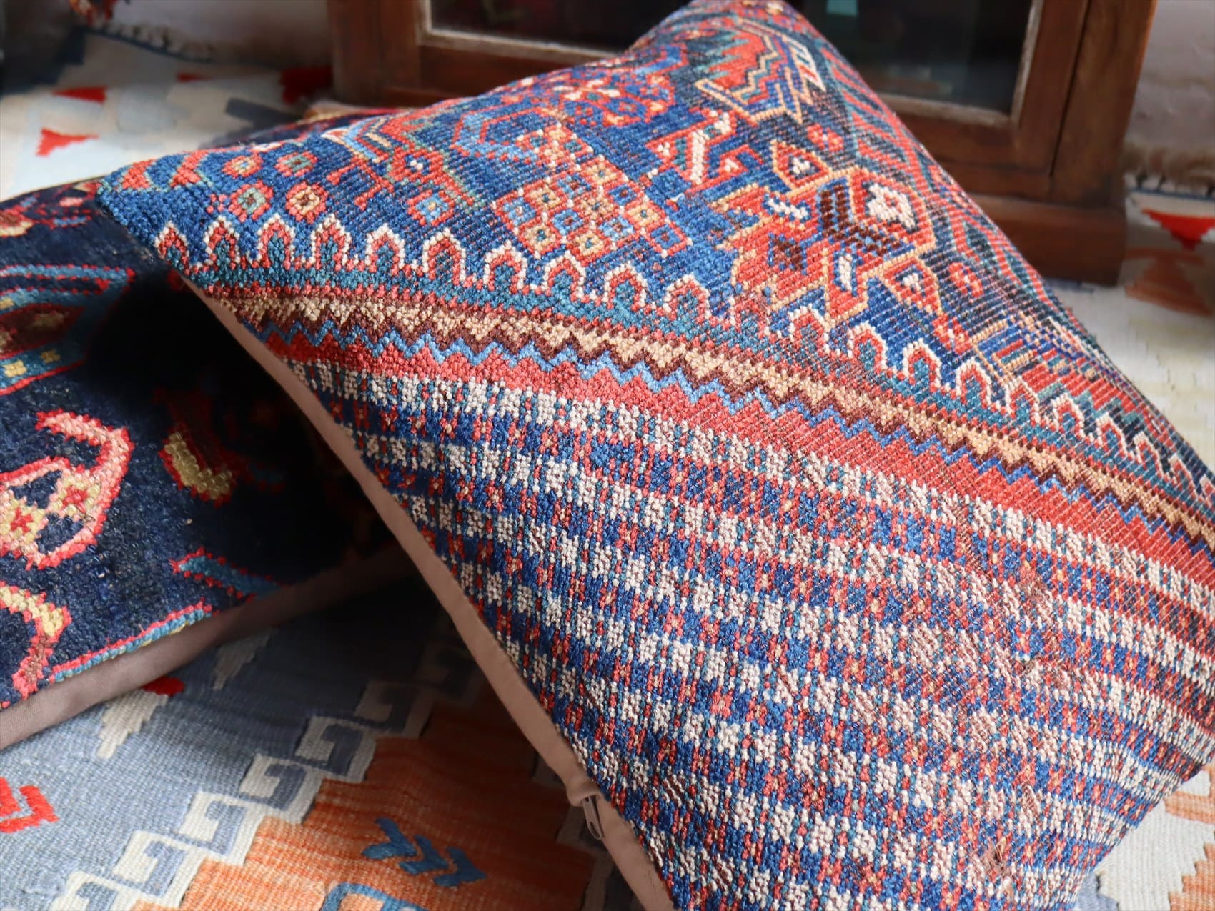 - クッションカバー ヴィンテージ パイル織り 絨毯 ビッグピロー 横長 長方形 54×46cm カシュカイ 幾何学モチーフ