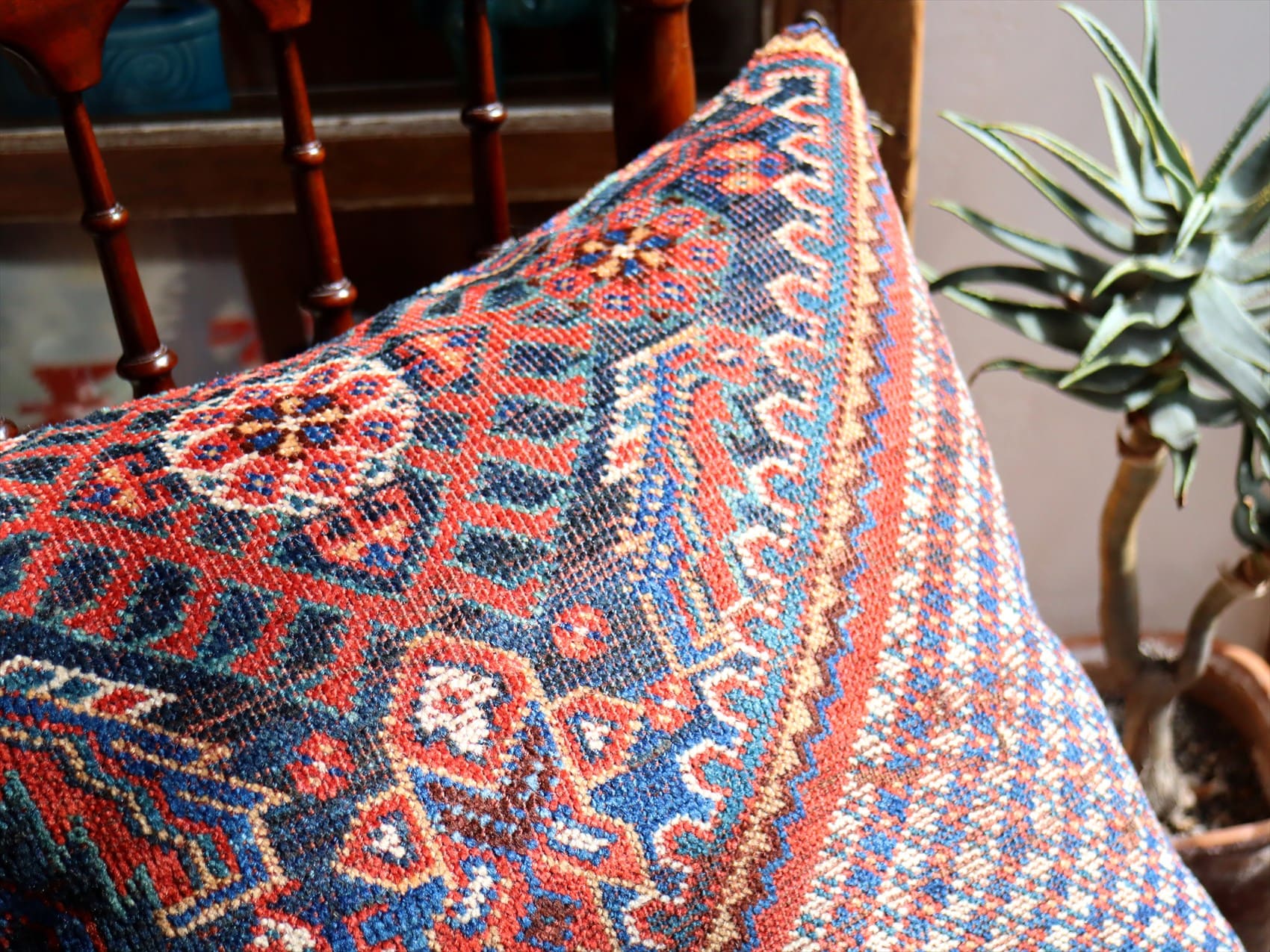 | 古い絨毯からカットされたもので、パイルはすり減ってあまり残っておらず、縦糸の見えている箇所があります。 オールドカーペットのクッションは、長い間家庭で使われていたり、ダメージがあったりする手織りカーペットを使っているため、表面のパイルはすり減って結び目が見えている部分などがあります。クッションに加工する前には、きれいに水洗いされています。 |