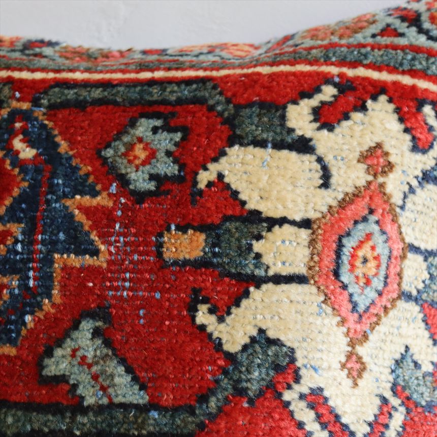 織り目がつまって、がっちりと厚みのある古い手織り絨毯を使ったクッションカバー。表面の毛足はところどころ擦り切れて、ヴィンテージ感があります。