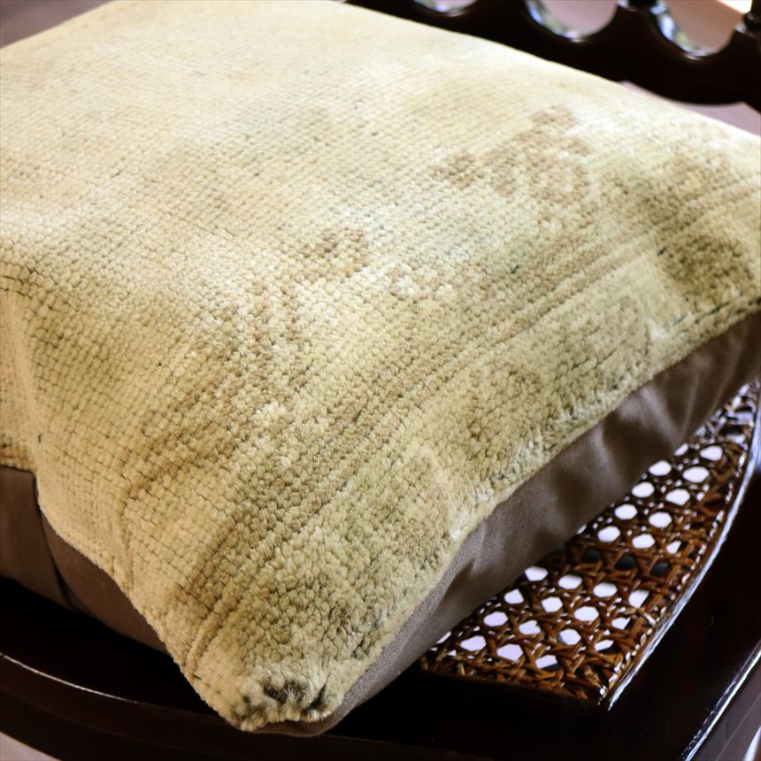 | オールドカーペットをブリーチして作られたクッションカバー。モノトーン系の渋い色合いと、素朴で落ち着いた雰囲気が魅力です。オリジナルラグのデザインがうっすら残っていて、ビンテージ感を楽しめるピースです。中綿は45×45cmをご使用ください。 |