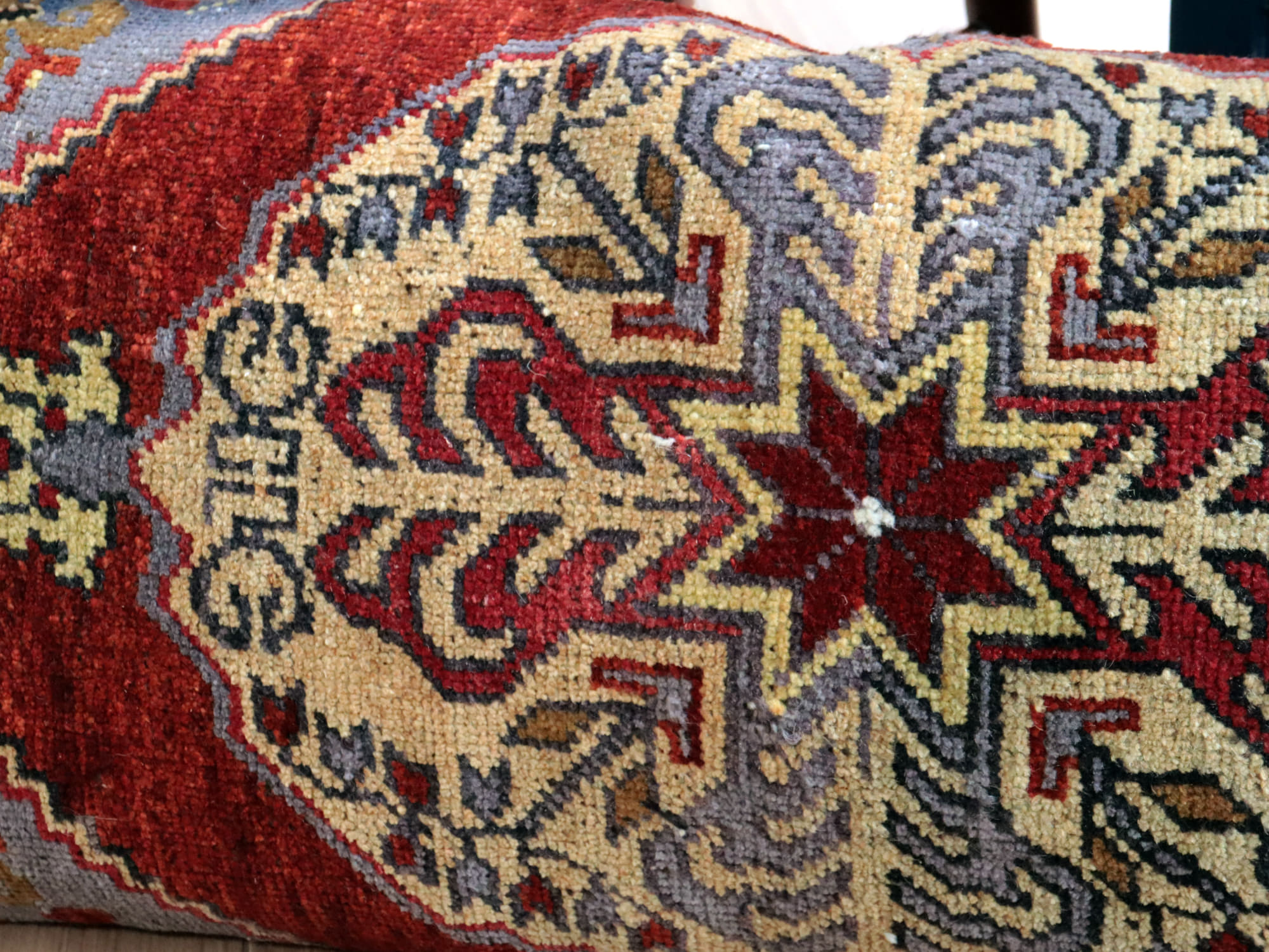 | アナトリア中央、コンヤ・タシュプナル地方で織られたヤストゥク(クッション用に織られた絨毯)です。オリジナルのサイズをいかしてそのままクッションに仕立ててあるため、中央に六角形のメダリオンがあるバランスよいデザインです。毛布やお布団をつめてクッションとしてお使いいただけます。 |