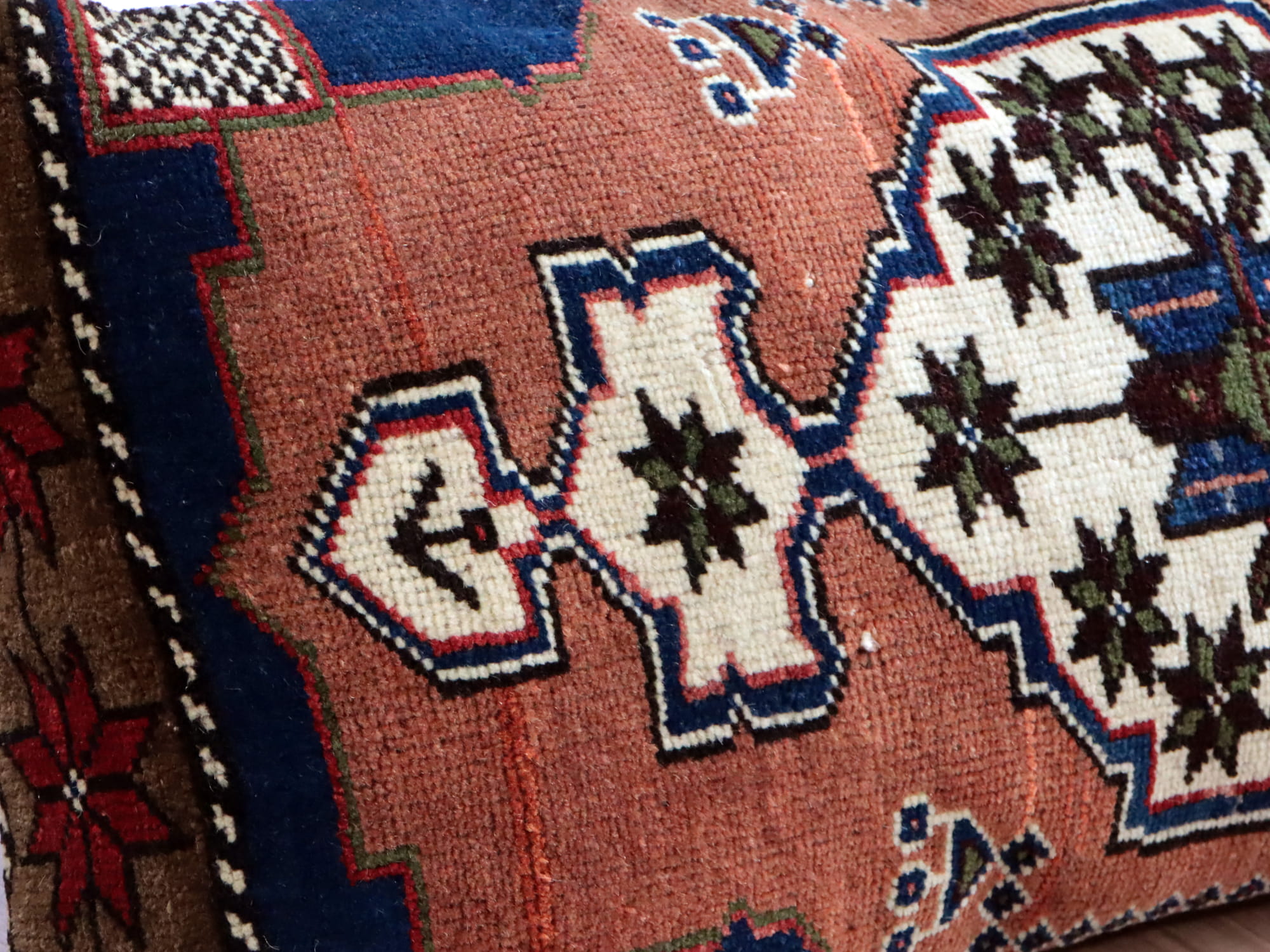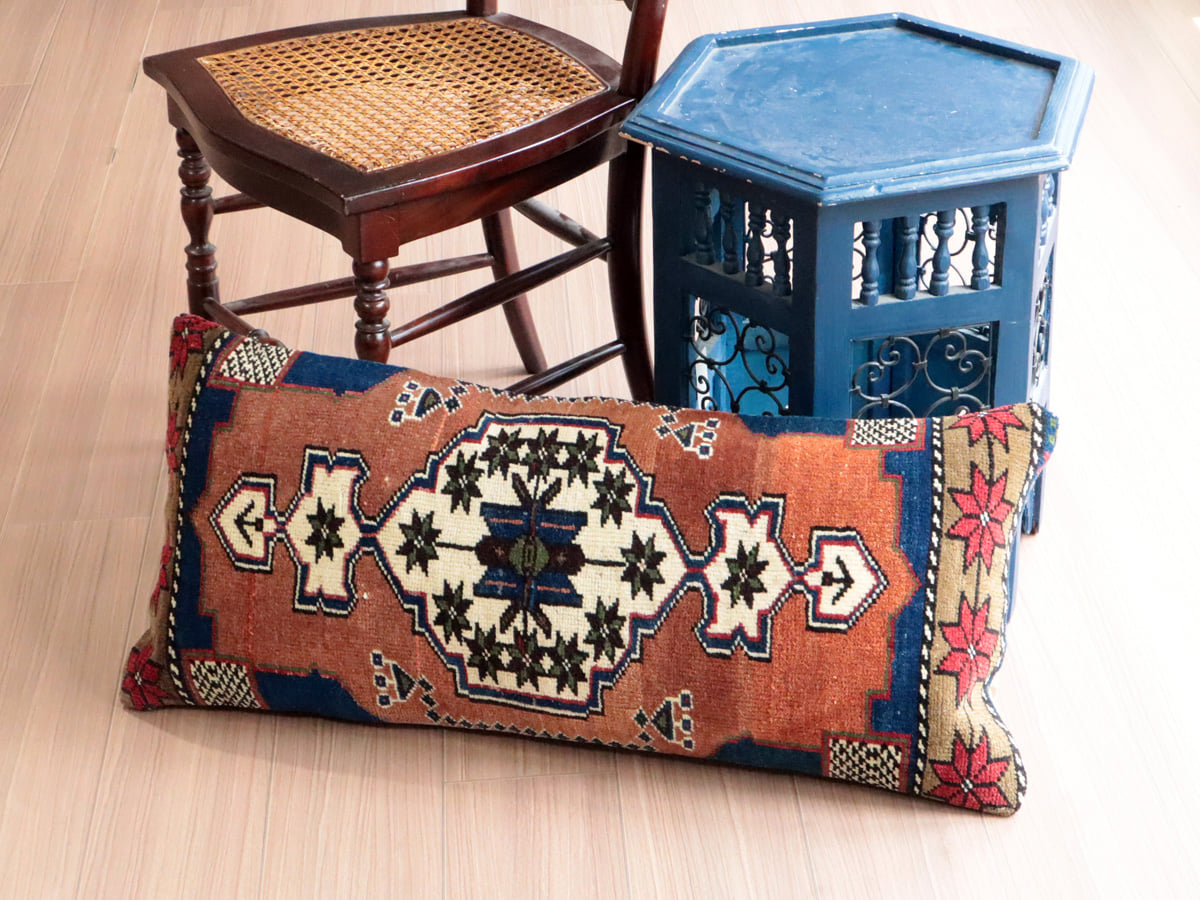 | アナトリア中央、コンヤ・タシュプナル地方で織られたヤストゥク(クッション用に織られた絨毯)です。オリジナルのサイズをいかしてそのままクッションに仕立ててあるため、中央に六角形のメダリオンがあるバランスよいデザインです。毛布やお布団をつめてクッションとしてお使いいただけます。 |