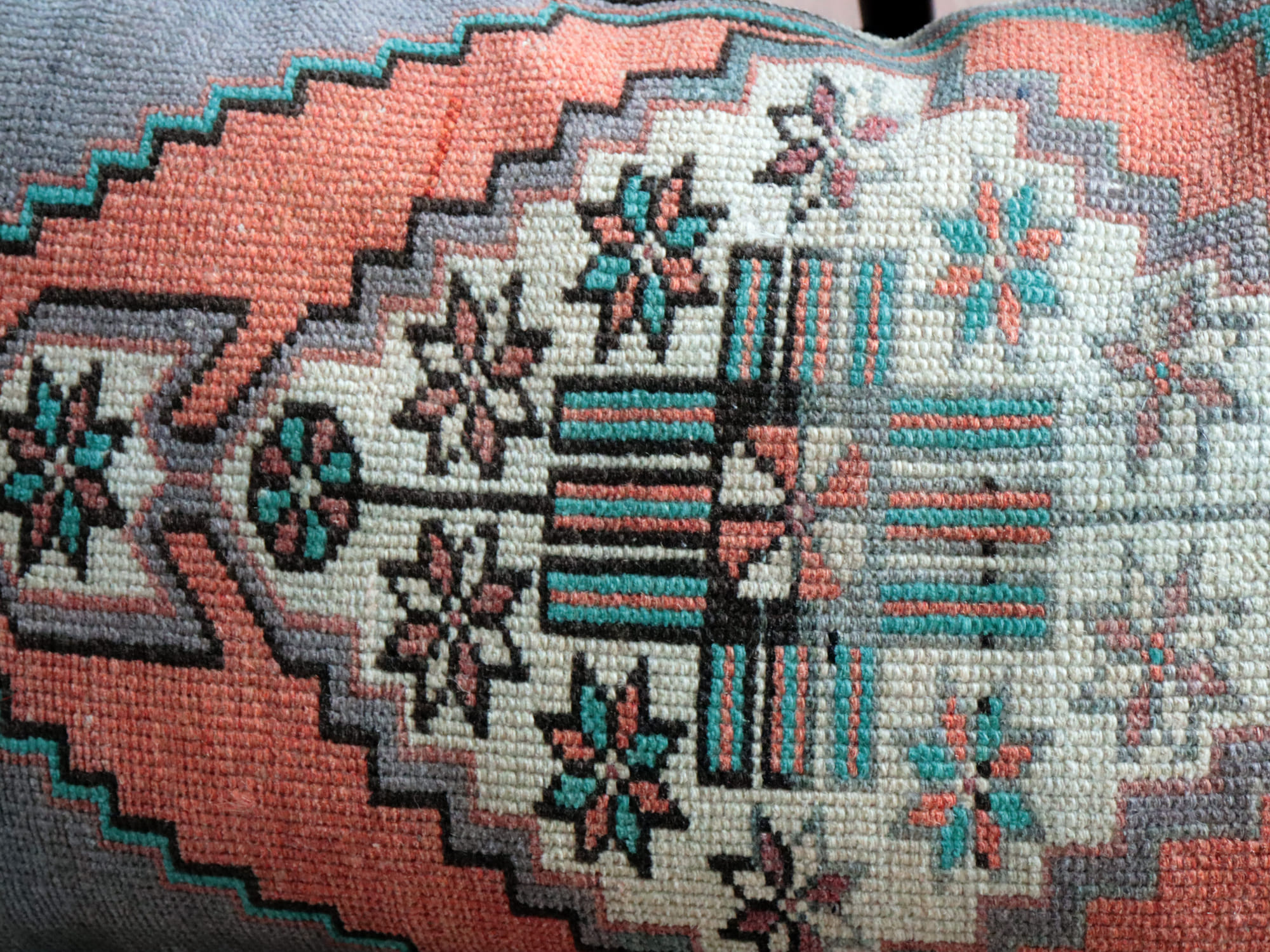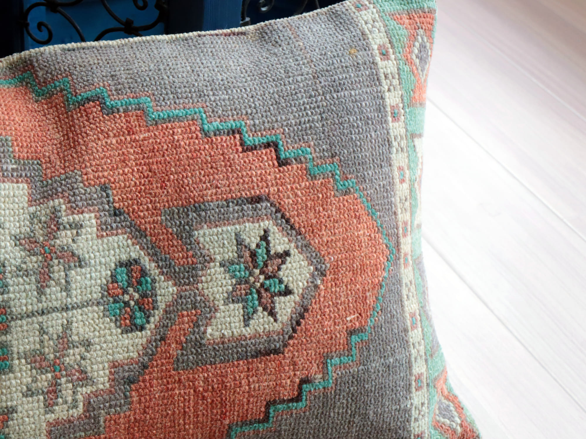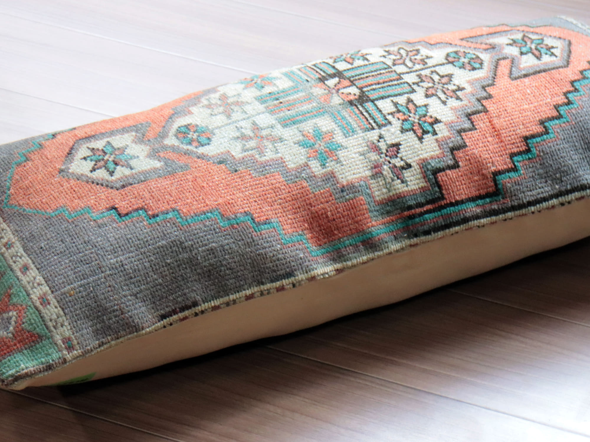 | アナトリア中央、コンヤ・タシュプナル地方で織られたヤストゥク(クッション用に織られた絨毯)です。オリジナルのサイズをいかしてそのままクッションに仕立ててあるため、中央に六角形のメダリオンがあるバランスよいデザインです。毛布やお布団をつめてクッションとしてお使いいただけます。 |