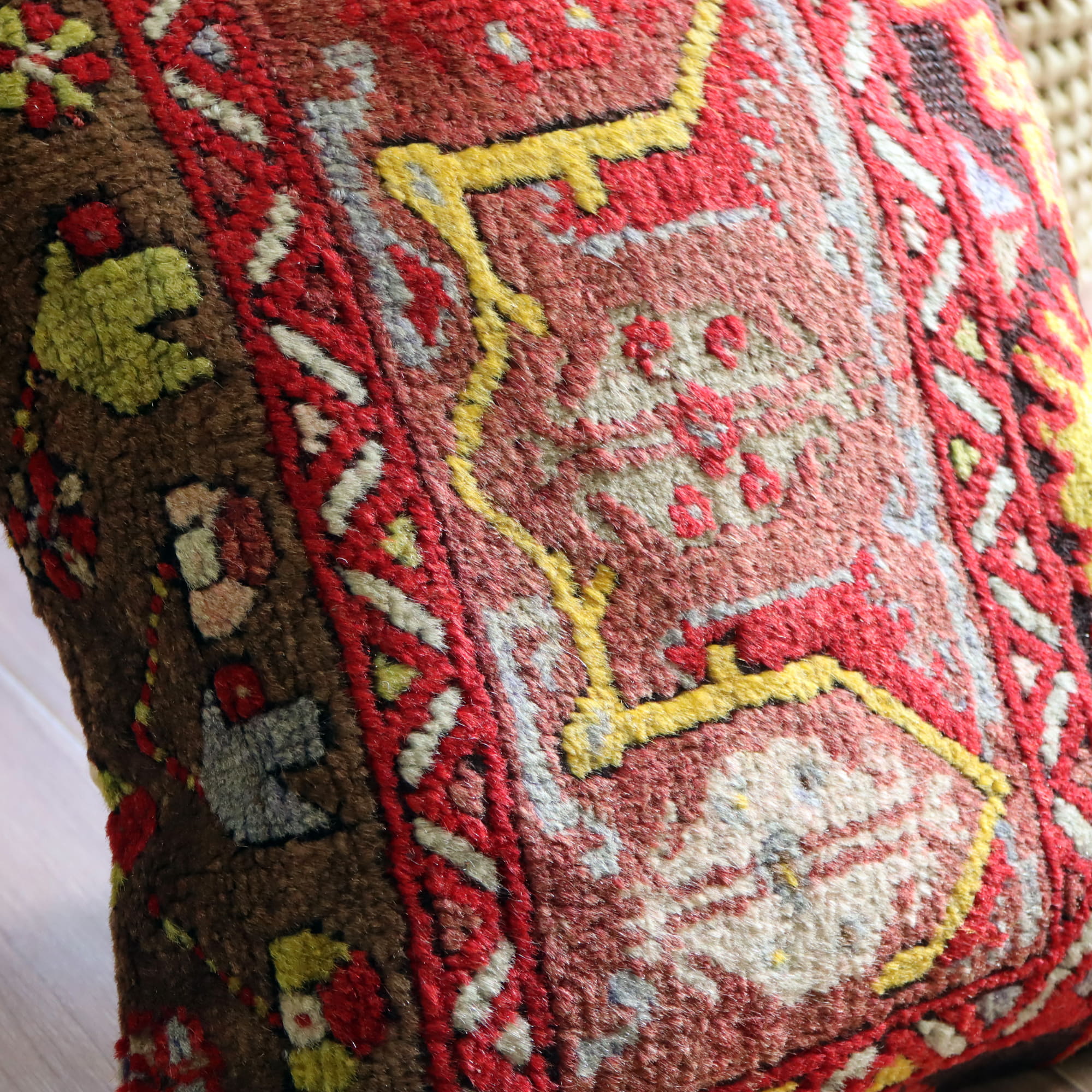 | アナトリア中央部シワス地方で織られた手織りラグを使ったクッションカバーです。織られてから50年前後経過していますが、ほとんど使われていなかった様子で、織られた当時の鮮やかな色を残しています。パイル(毛足)は長めに残っていて、表面はなめらかな肌ざわりです。 |