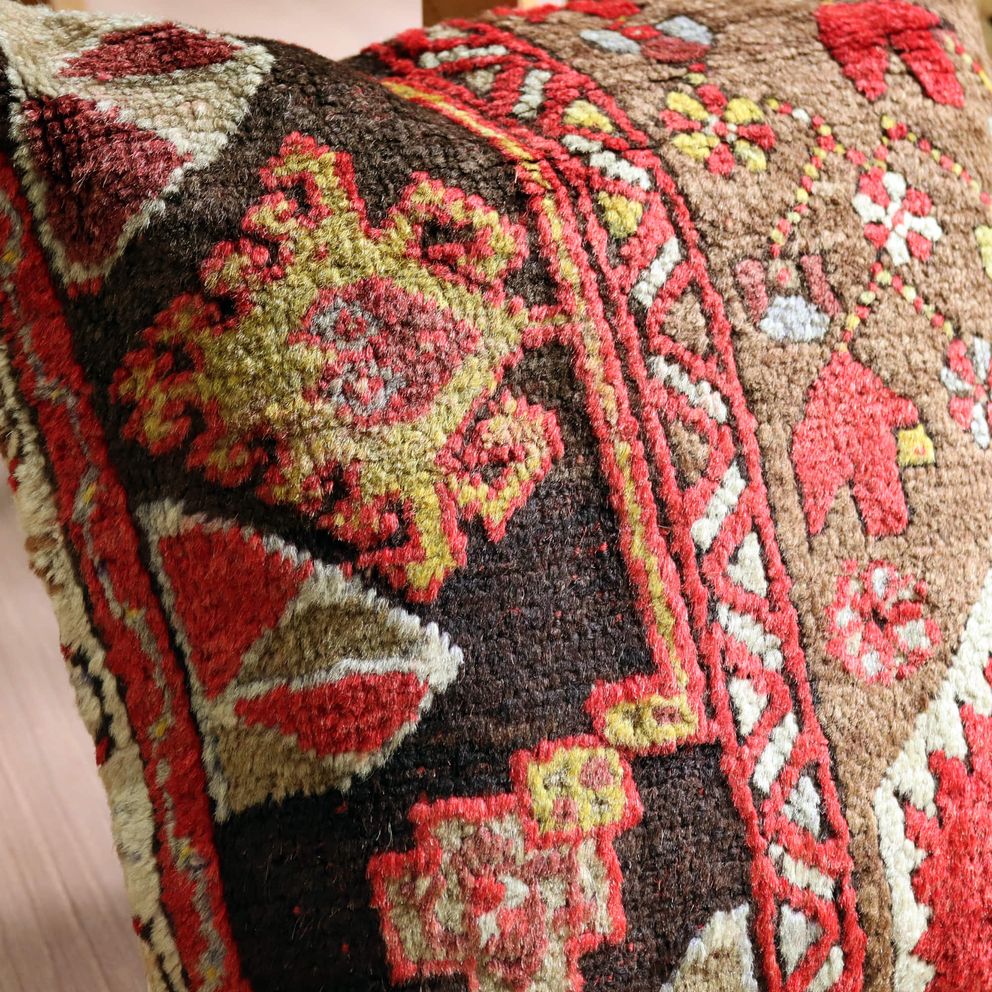 | アナトリア中央部シワス地方で織られた手織りラグを使ったクッションカバーです。織られてから50年前後経過していますが、ほとんど使われていなかった様子で、織られた当時の鮮やかな色を残しています。パイル(毛足)は長めに残っていて、表面はなめらかな肌ざわりです。 |