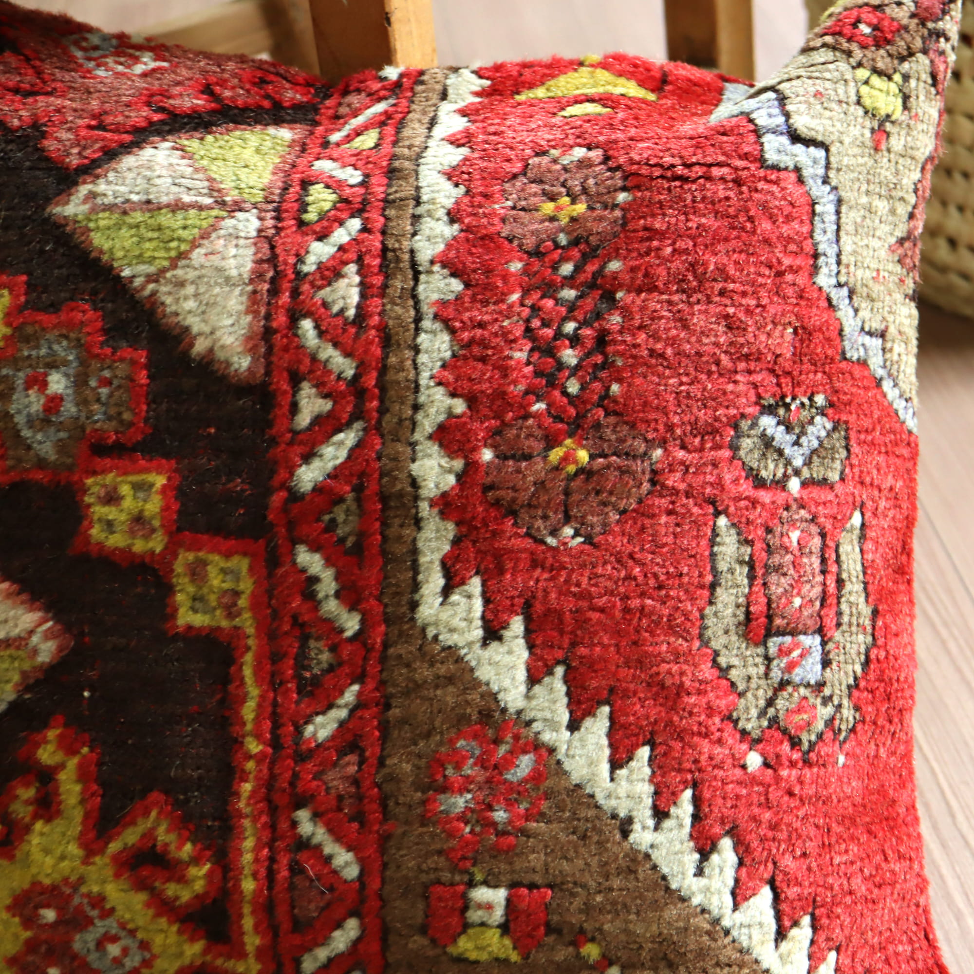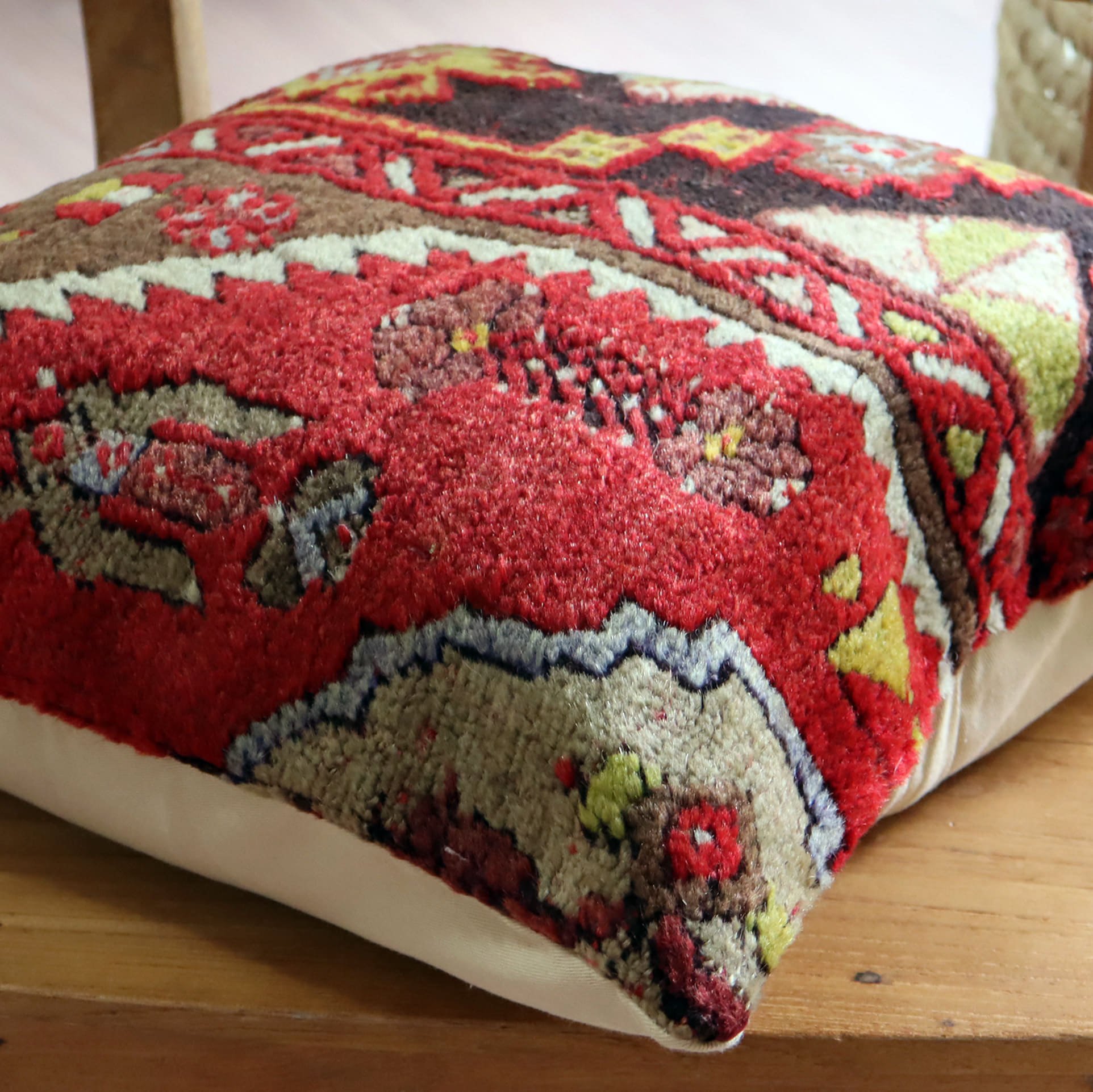 | アナトリア中央部シワス地方で織られた手織りラグを使ったクッションカバーです。織られてから50年前後経過していますが、ほとんど使われていなかった様子で、織られた当時の鮮やかな色を残しています。パイル(毛足)は長めに残っていて、表面はなめらかな肌ざわりです。 |