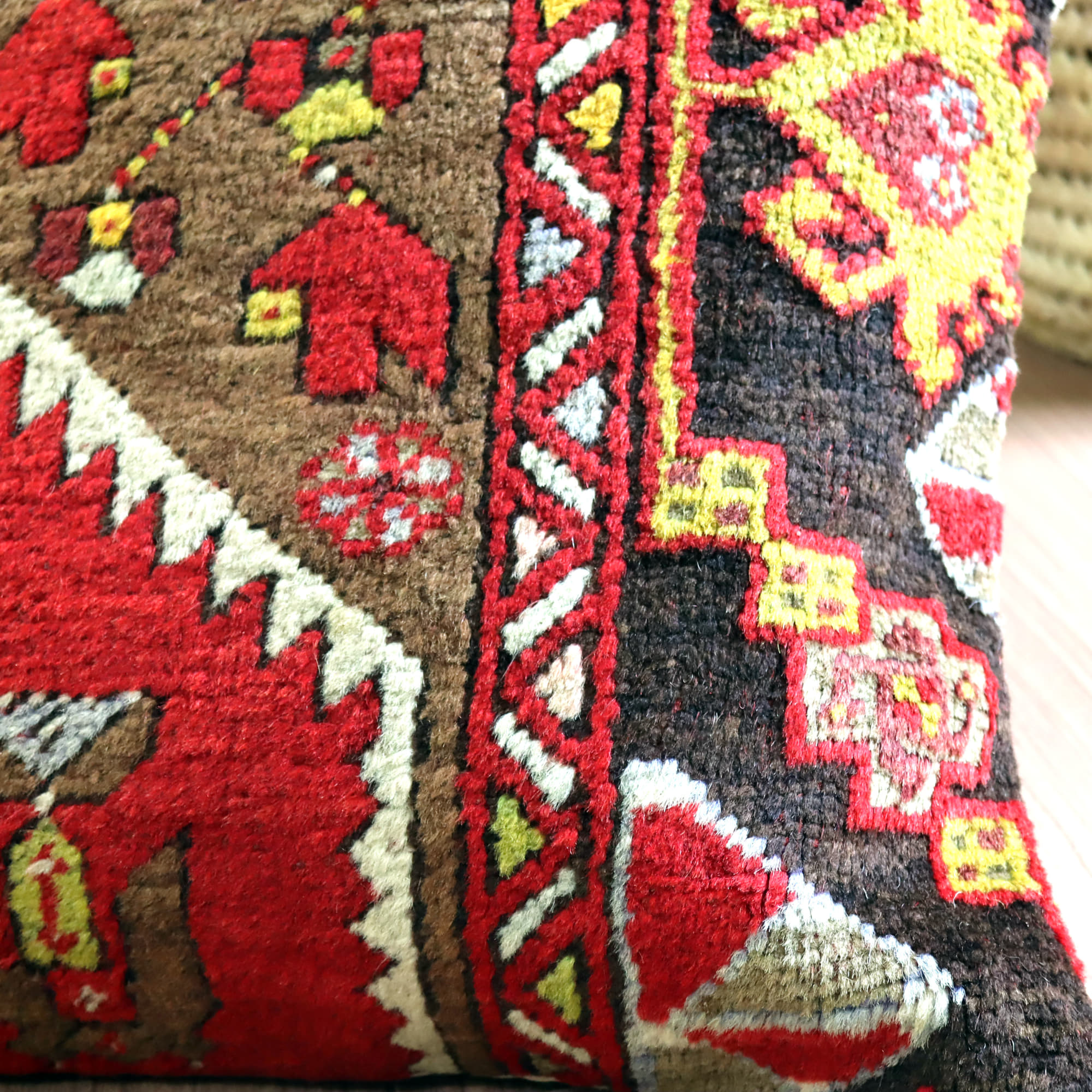 | アナトリア中央部シワス地方で織られた手織りラグを使ったクッションカバーです。織られてから50年前後経過していますが、ほとんど使われていなかった様子で、織られた当時の鮮やかな色を残しています。パイル(毛足)は長めに残っていて、表面はなめらかな肌ざわりです。 |