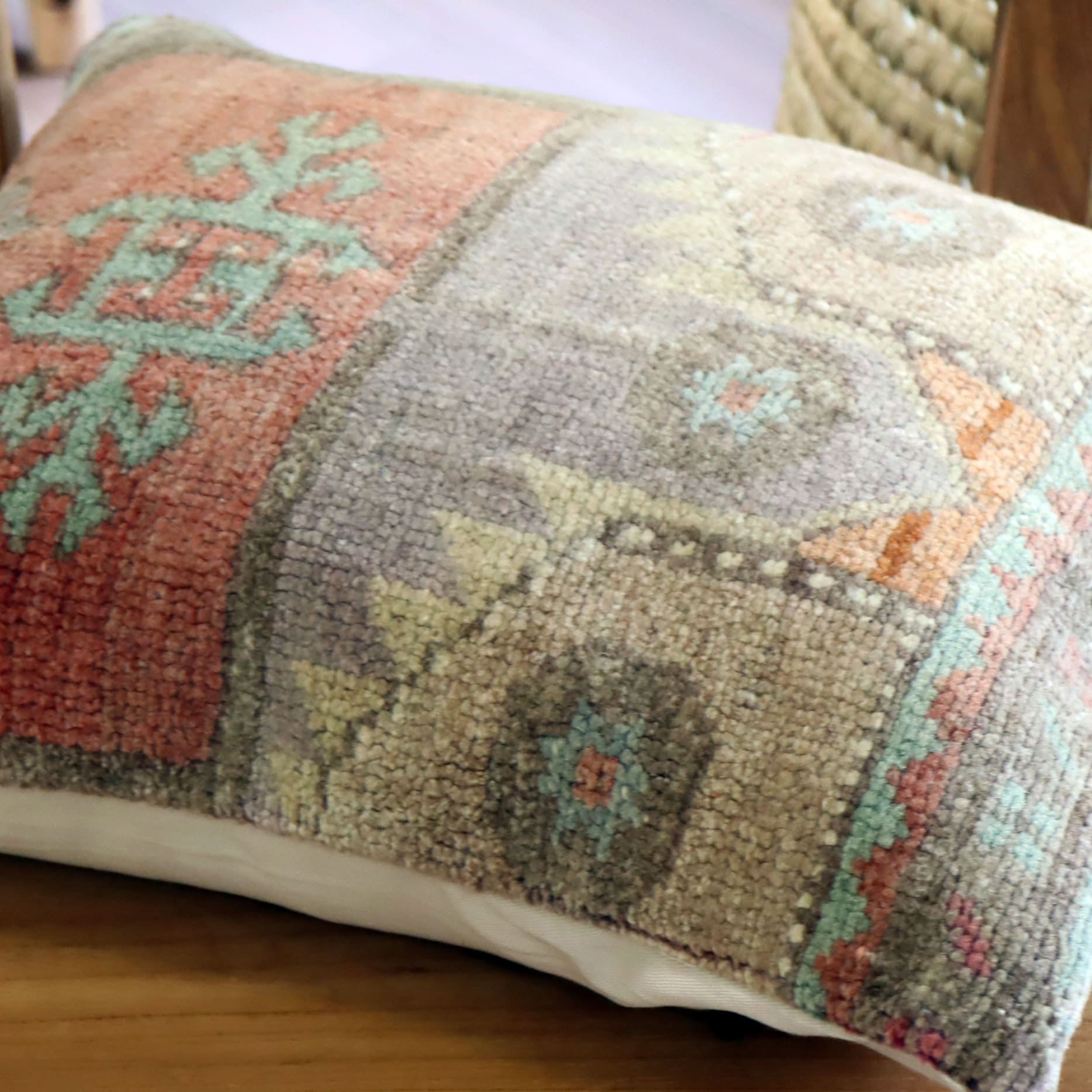 | セルジューク王朝の古都として知られる、コンヤ地方で織られた手織りラグをつかっています。ほどよく色褪せて、ソフトな印象のクッションカバーです。中綿は45×45cmをご使用ください。 |