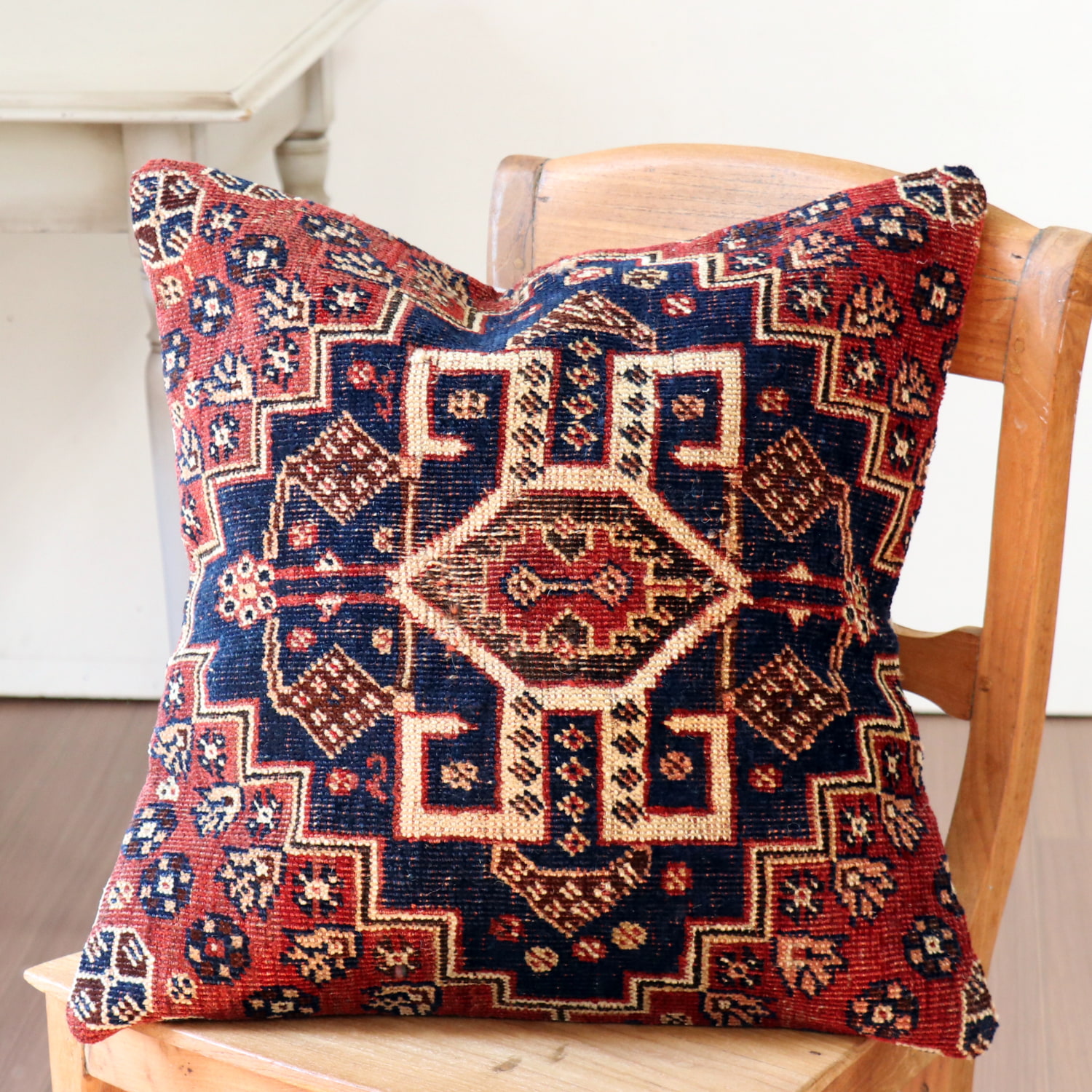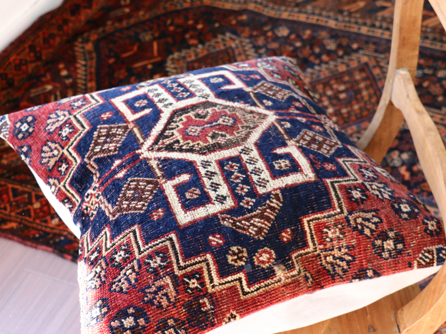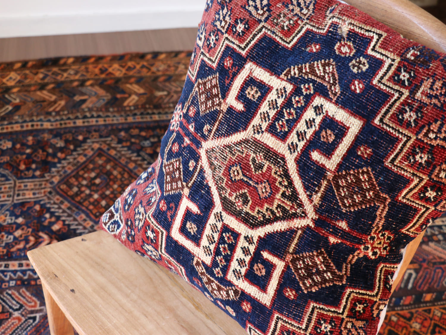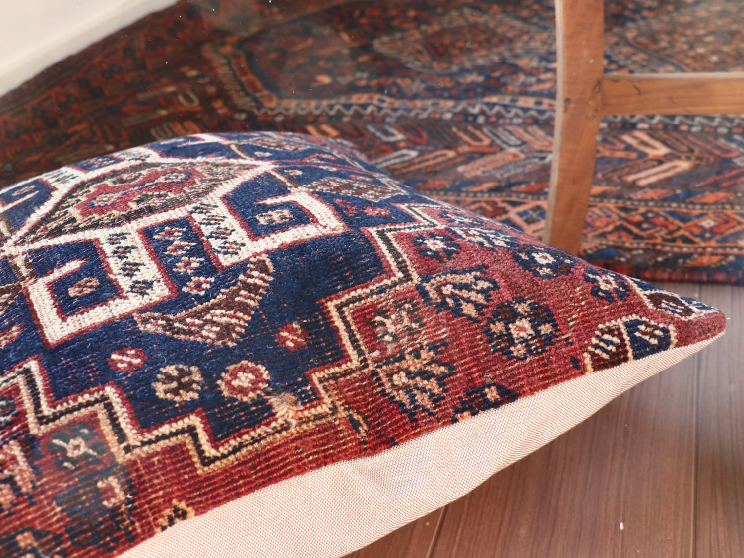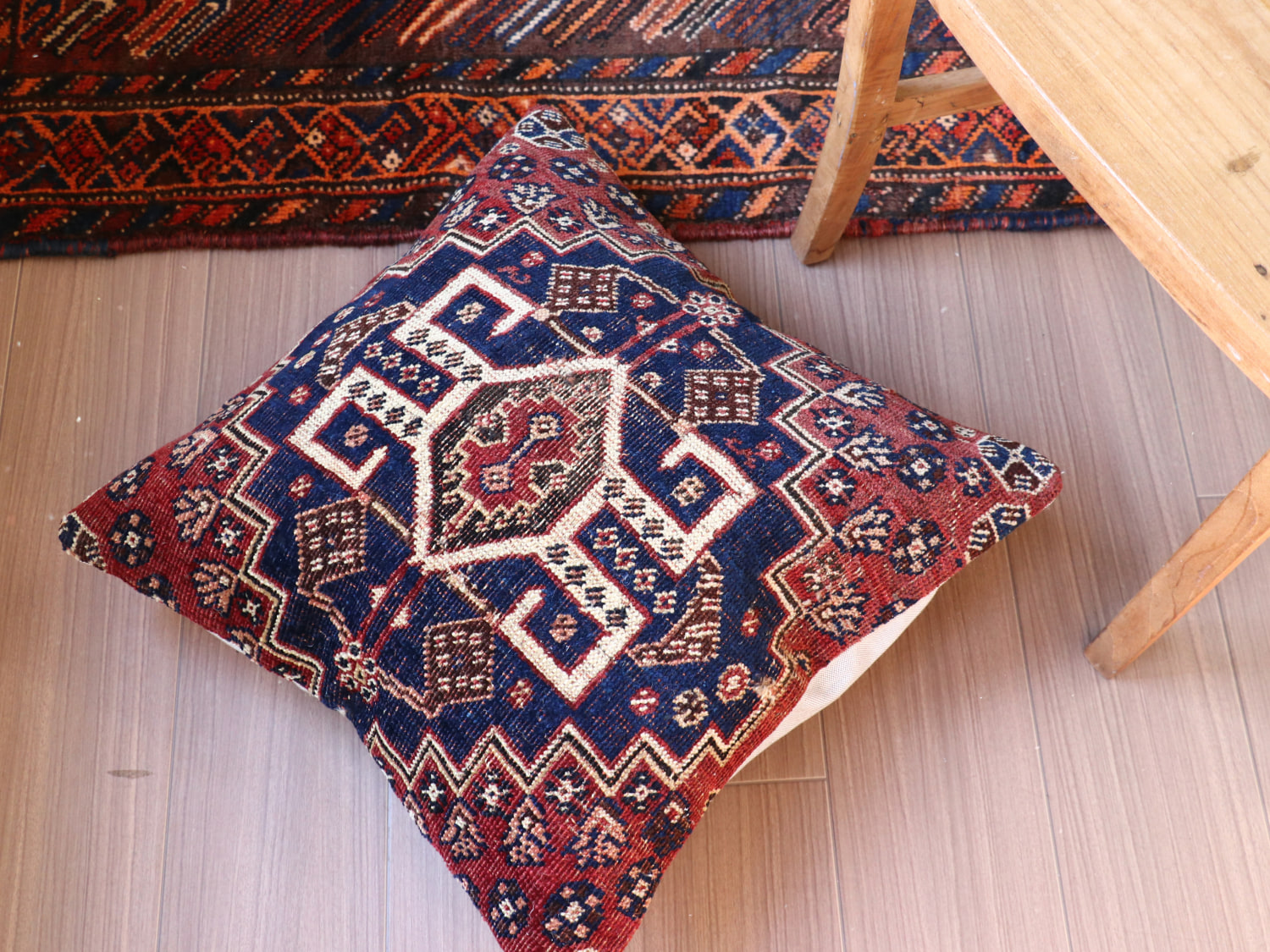 | 20世紀初頭に織られたアンティークラグからカットされたパイル織り絨毯のクッションカバーです。イラン南部に暮らすカシュカイ族のもので、天然染料による美しい色が100年経った現在でも、きれいに残っています。 |
