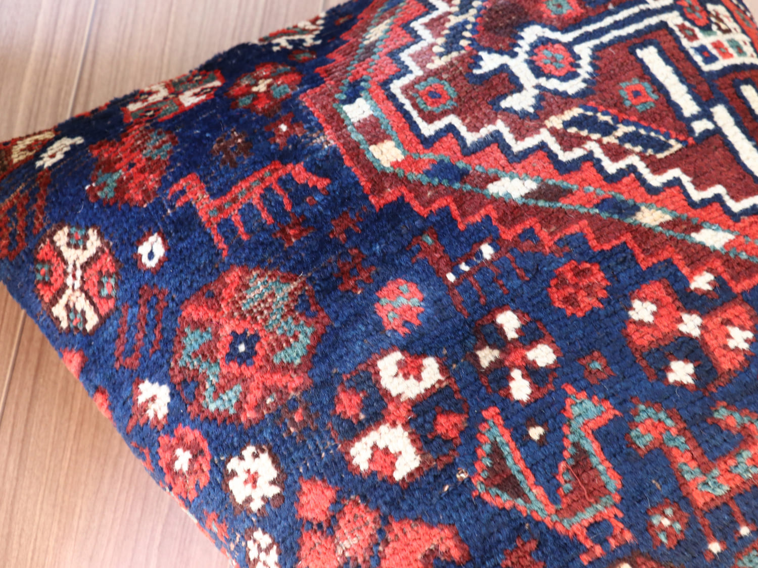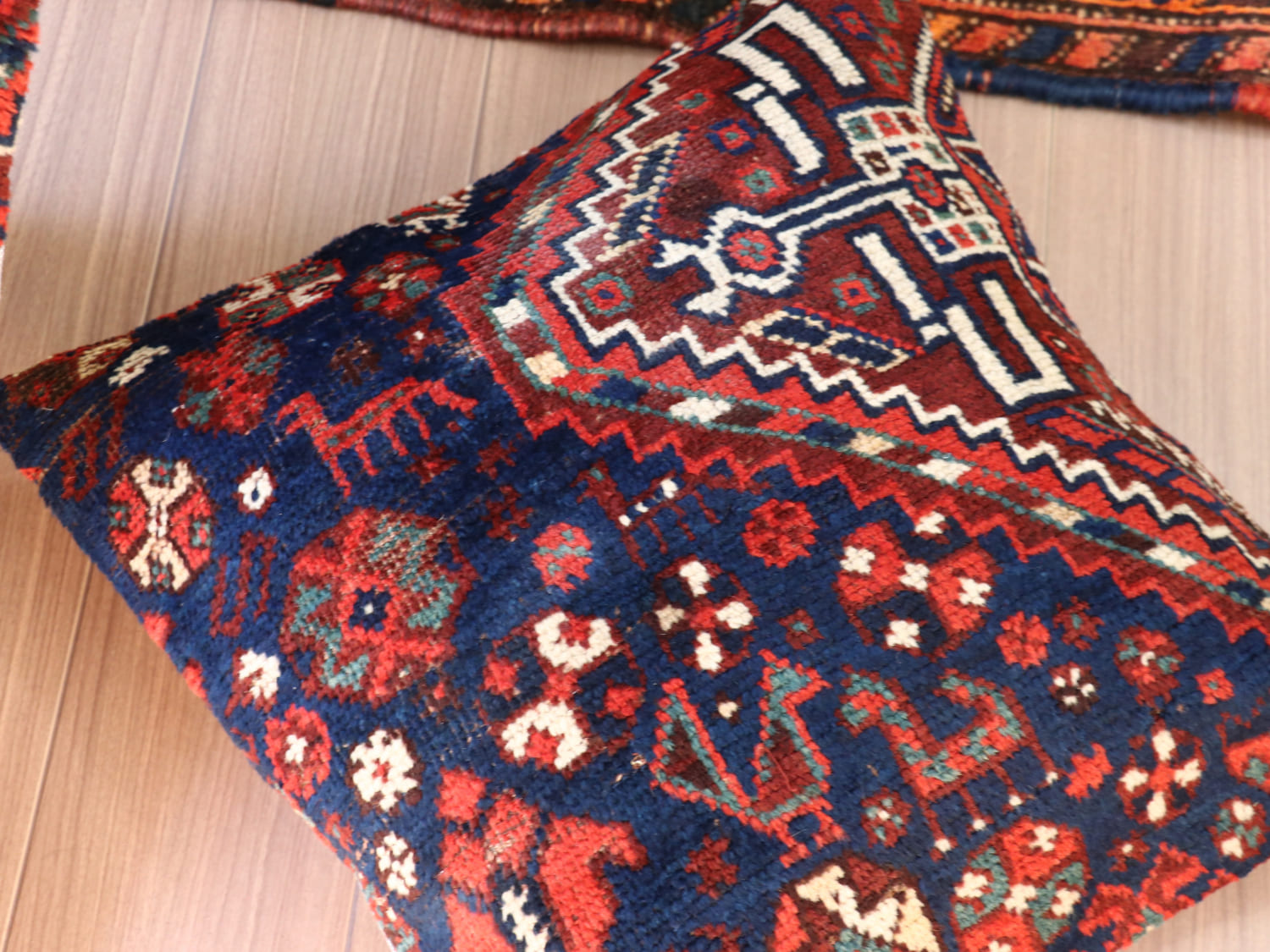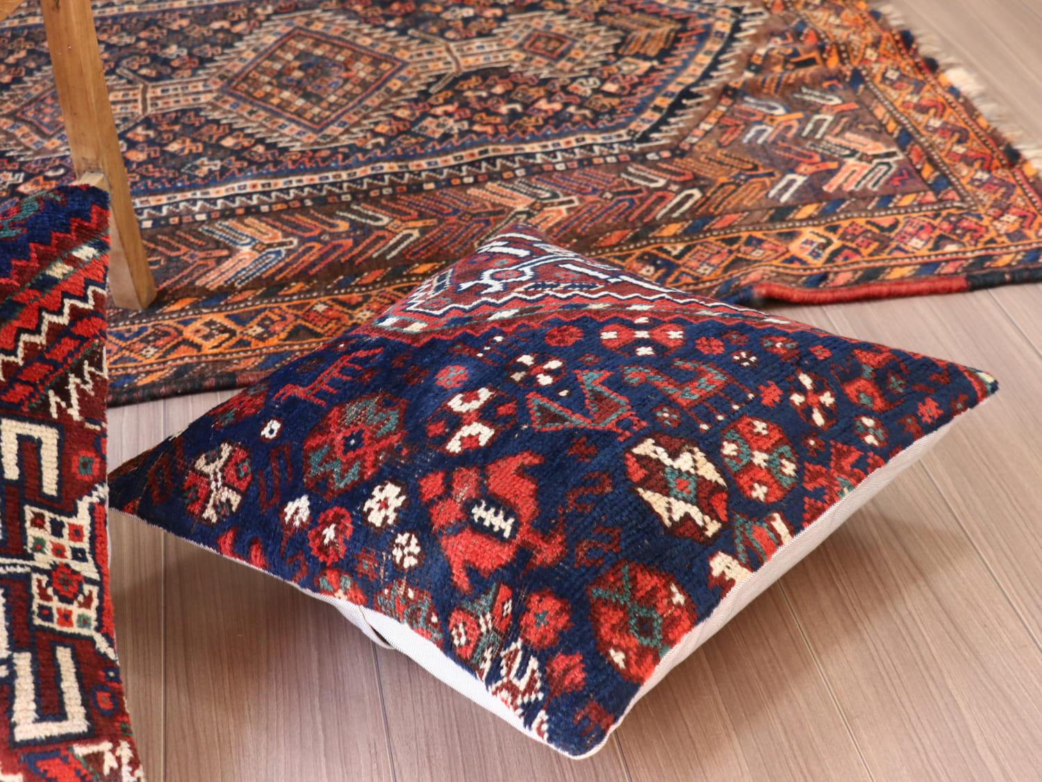 | 20世紀初頭に織られたアンティークラグからカットされたパイル織り絨毯のクッションカバーです。イラン南部に暮らすカシュカイ族のもので、天然染料による美しい色が100年経った現在でも、きれいに残っています。 |